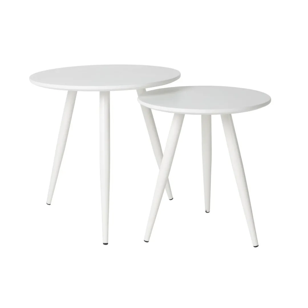 Deze set van twee bijzettafels, de Bijzettafel Daven Wit, brengt elegantie en rust in je woonkamer met hun warme witte uitstraling. De ronde vormen en het bescheiden formaat zorgen ervoor dat ze zich moeiteloos voegen naar elk interieur, of dat nu modern, Scandinavisch of klassiek is. Samen vormen ze niet alleen praktische bijzetplekken, maar ook een stijlvol duo dat extra sfeer toevoegt aan je zithoek.