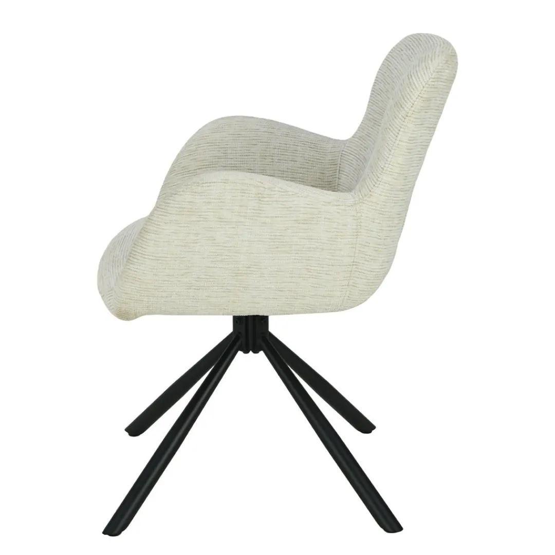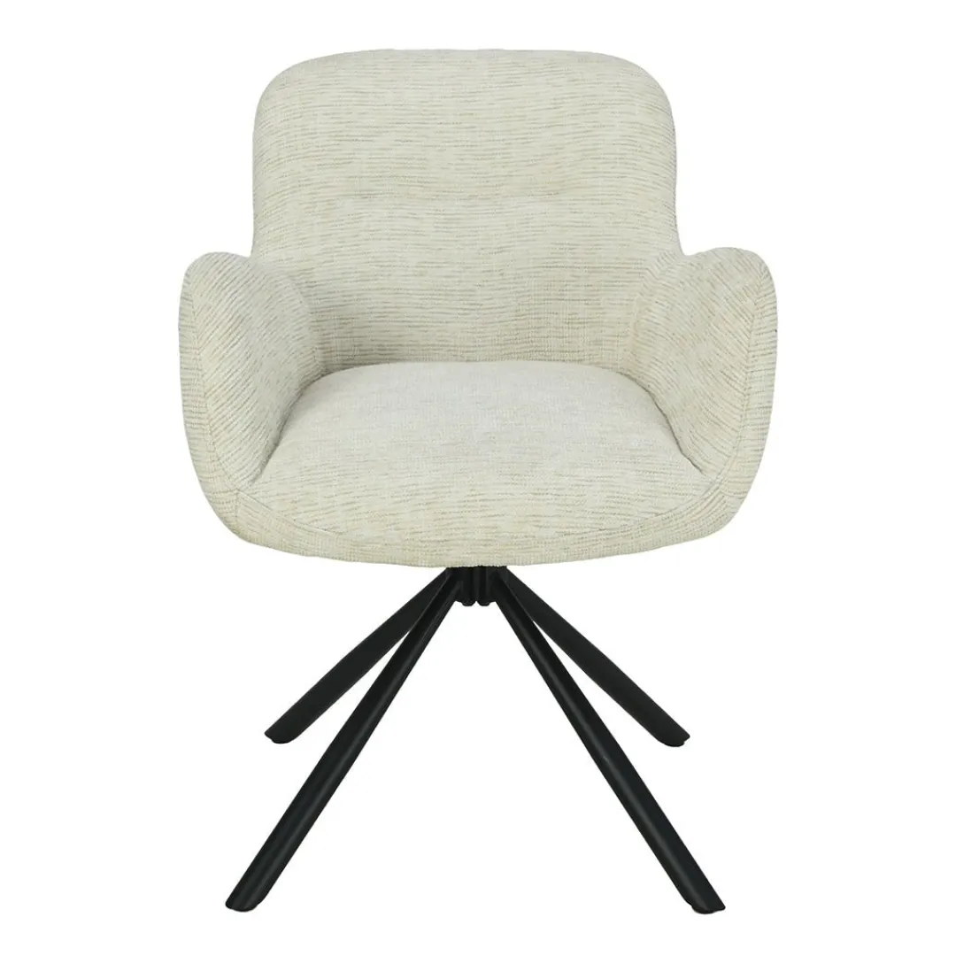 Eetkamerstoel Albi Wit is een stijlvolle toevoeging aan je eetkamer. De witte stoffen bekleding geeft de stoel een frisse en moderne uitstraling, terwijl het zwart gepoedercoate metalen onderstel een stoer accent toevoegt. De armleuningen bieden extra comfort en ondersteuning.
