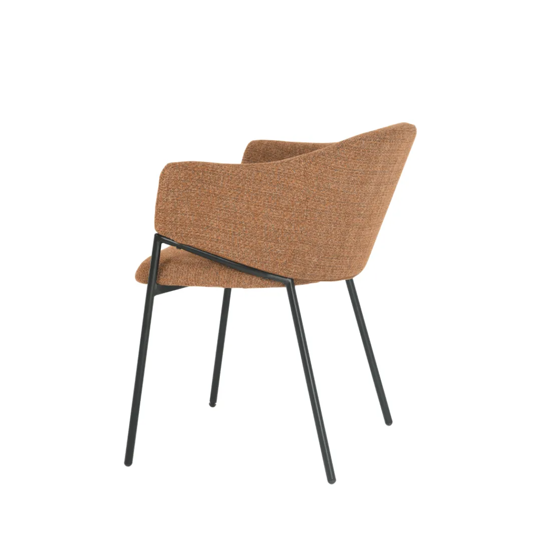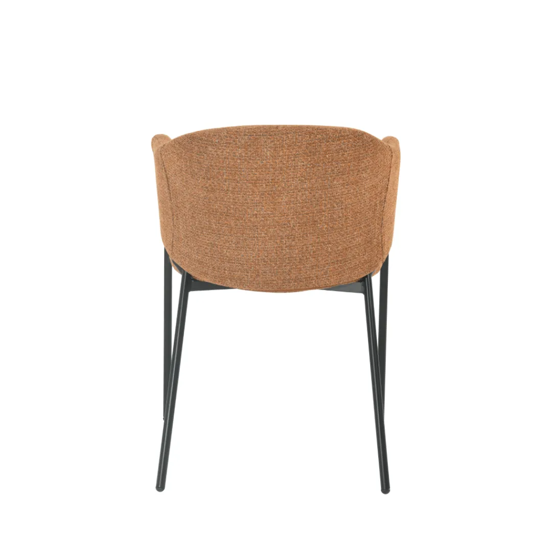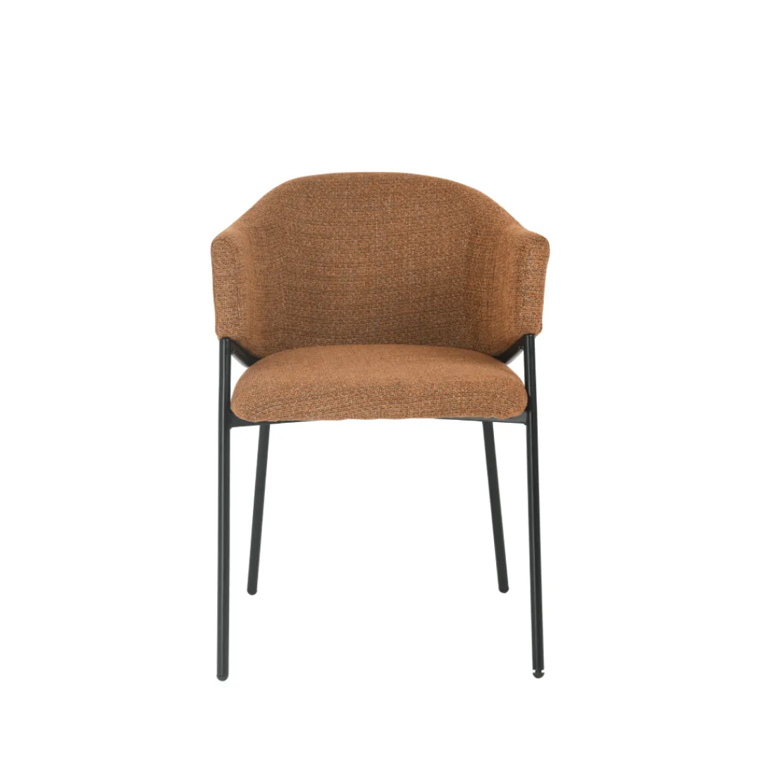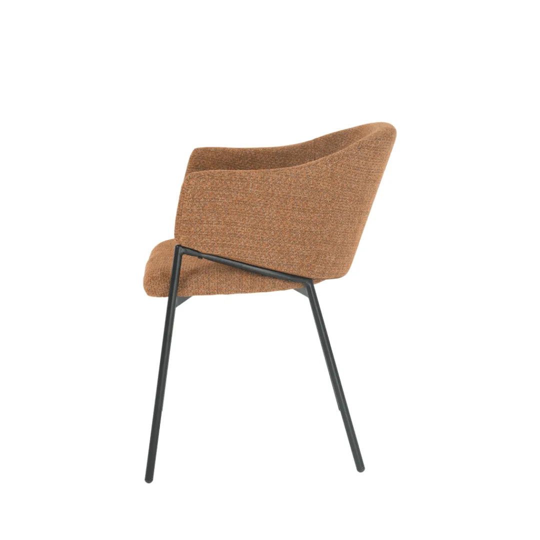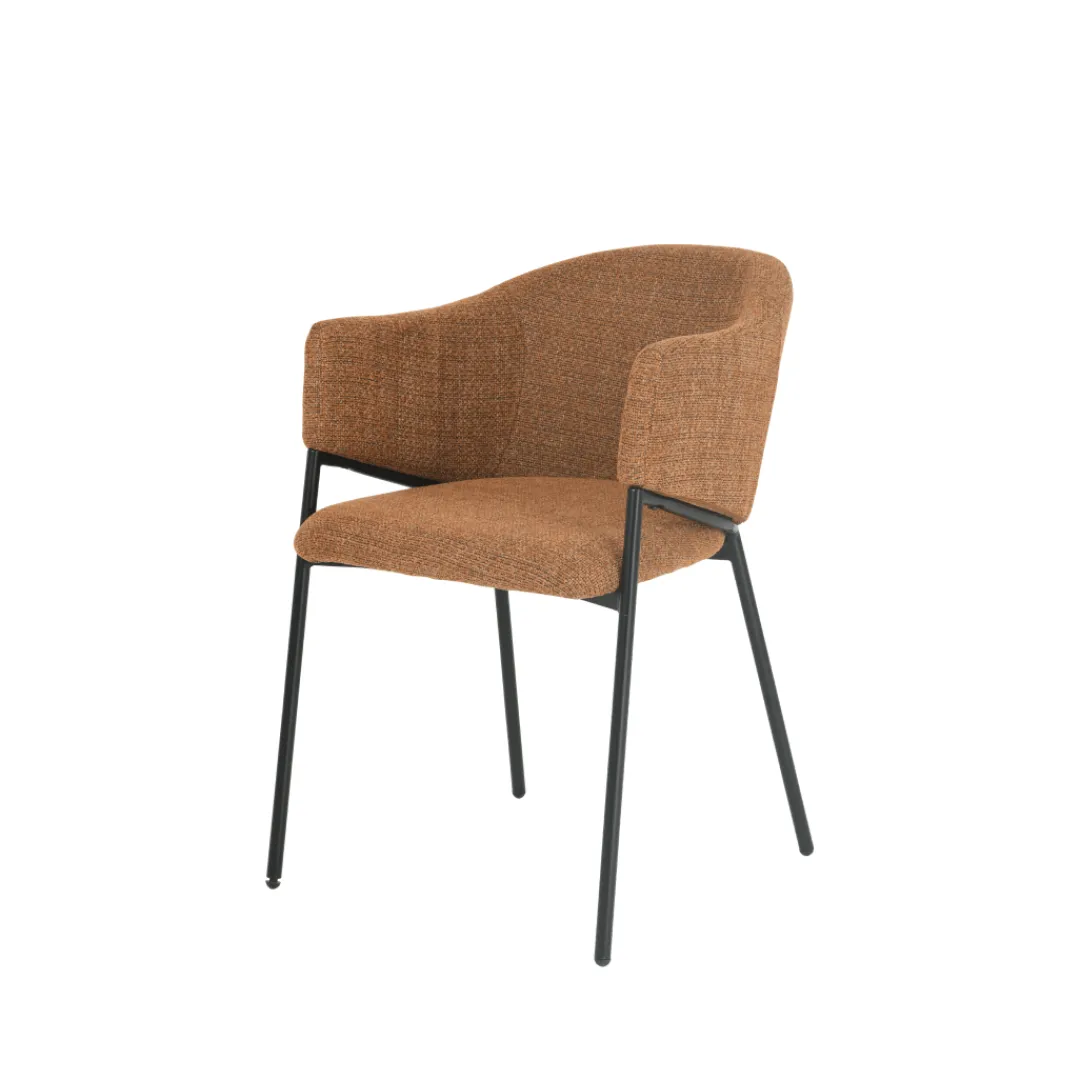 De perfecte balans tussen stijl en duurzaamheid wordt bereikt door de harmonieuze samensmelting van een cognac-gekleurde linnen bekleding en een strak, zwart metalen onderstel. Deze combinatie creëert een eigentijdse uitstraling die de aandacht trekt. Het stevige zwarte onderstel biedt onwrikbare stabiliteit, terwijl de linnen bekleding een zachte, comfortabele zitervaring garandeert.