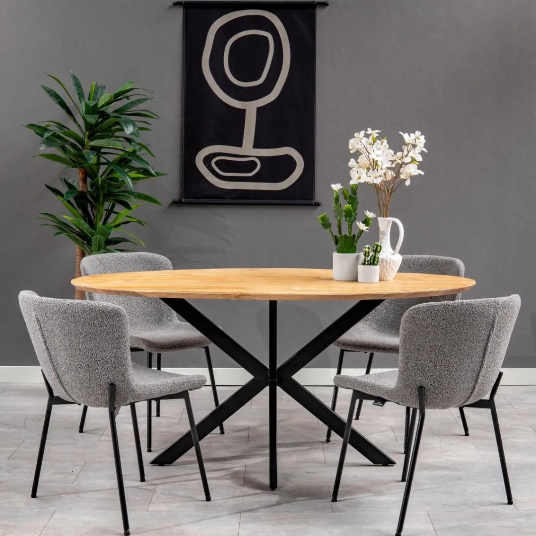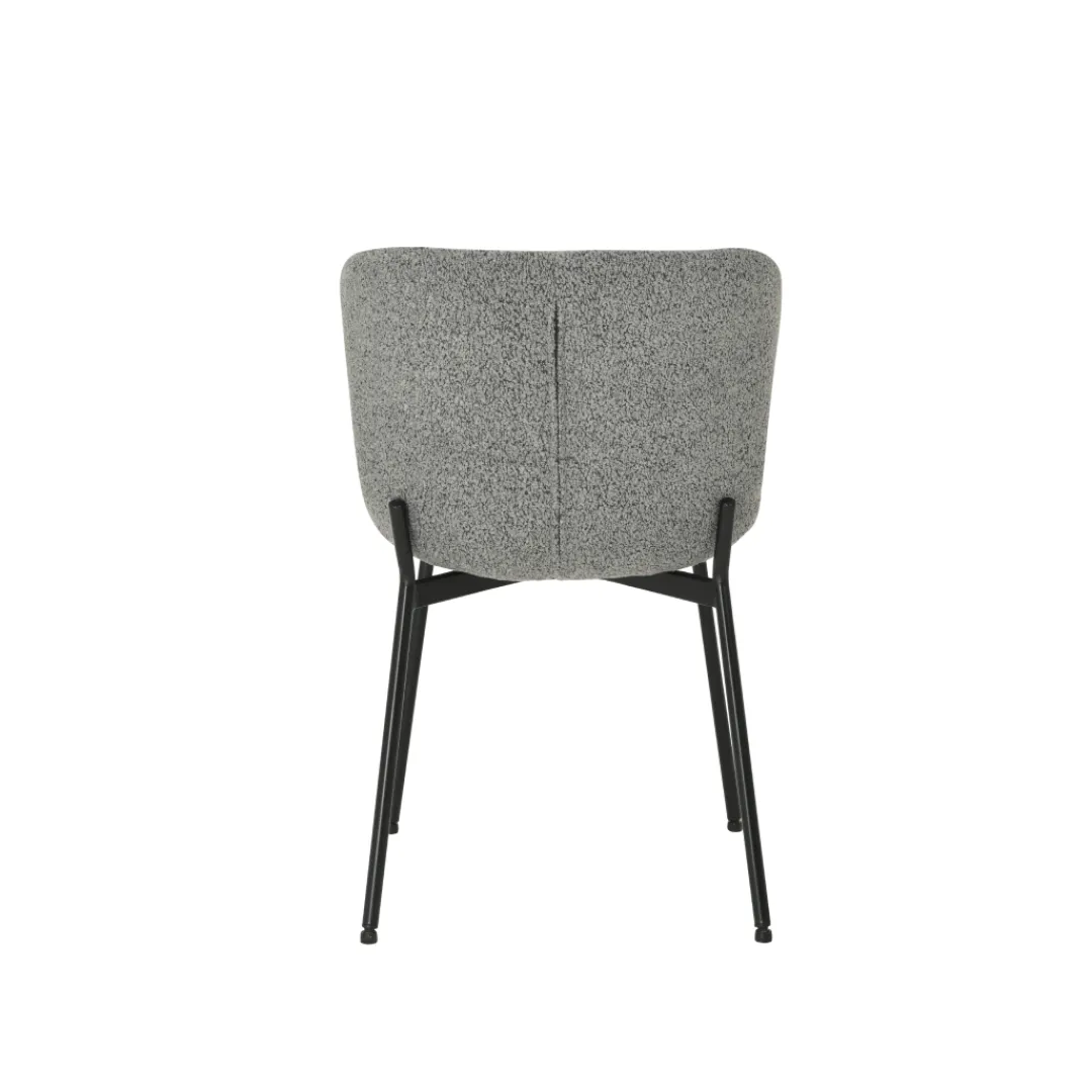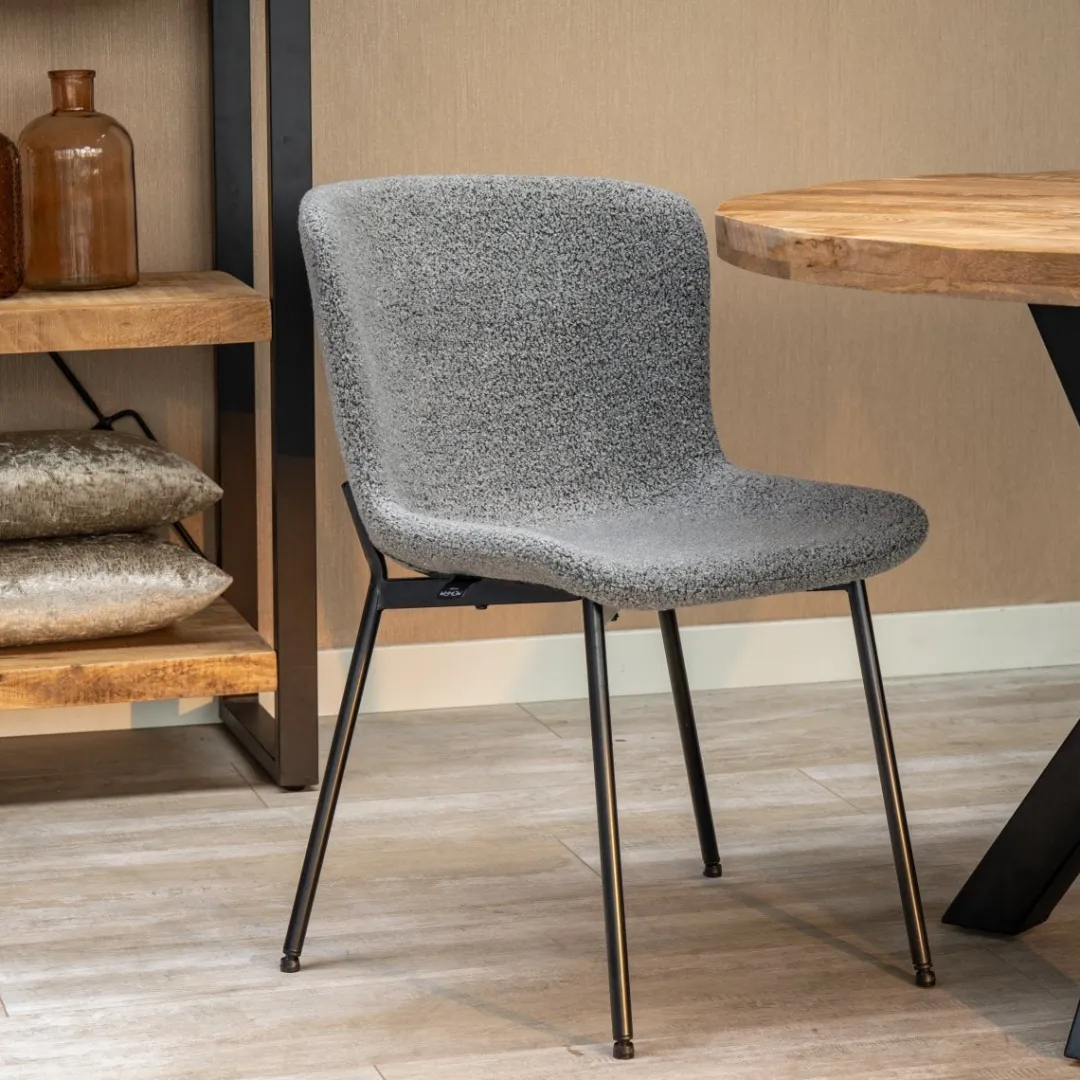 Creëer een verfijnde eetkamer met de Lille eetkamerstoel in de kleur donkergrijs. De zachte bouclé stof bekleding in deze elegante tint voegt een vleugje luxe toe aan je interieur.