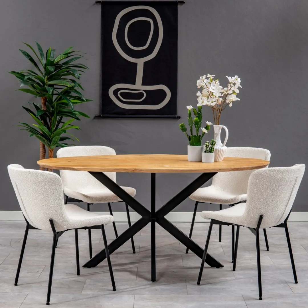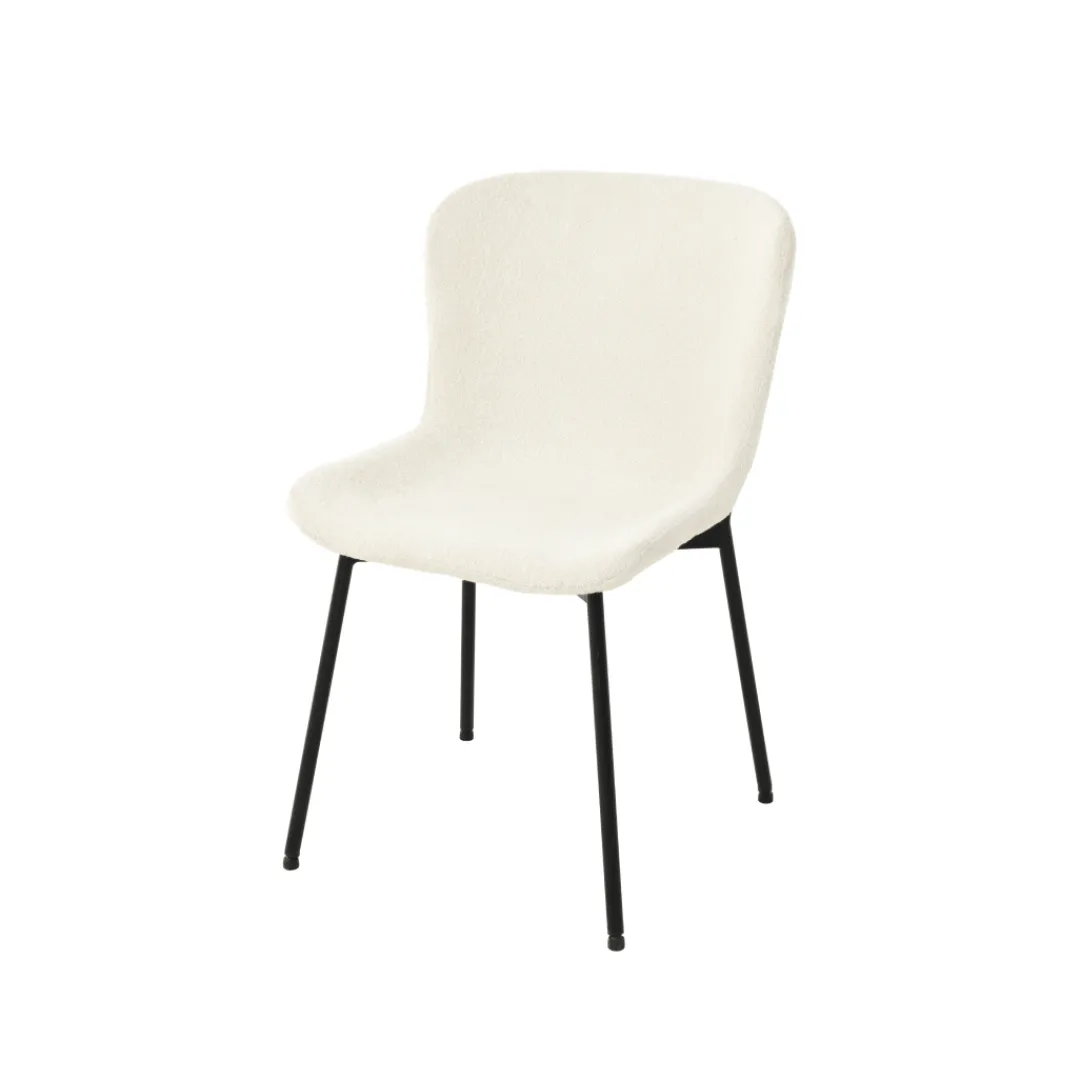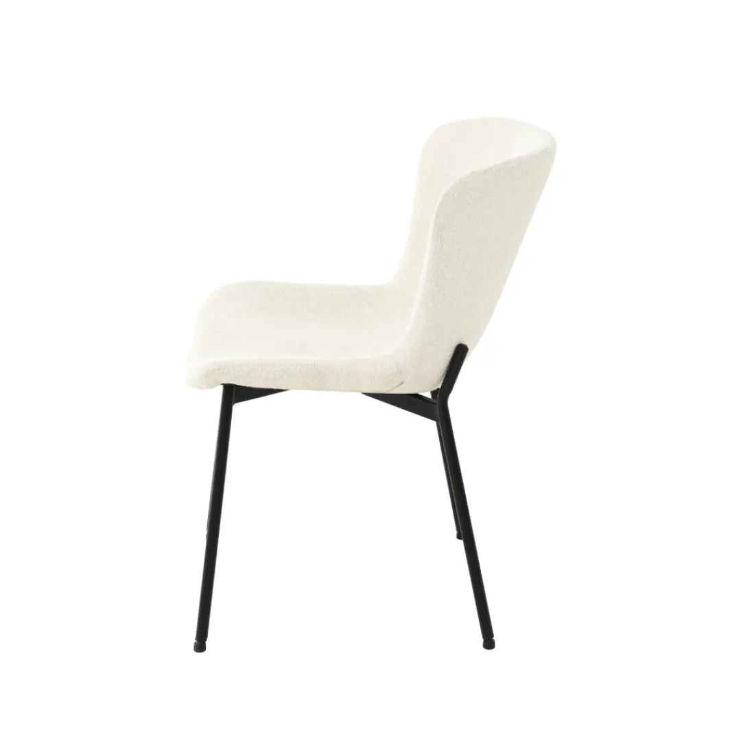 Ga voor tijdloze elegantie in je eetkamer met de Lille eetkamerstoel in de kleur wit. De zachte bouclé stof bekleding in deze heldere tint brengt een gevoel van ruimte en verfijning in je interieur.
