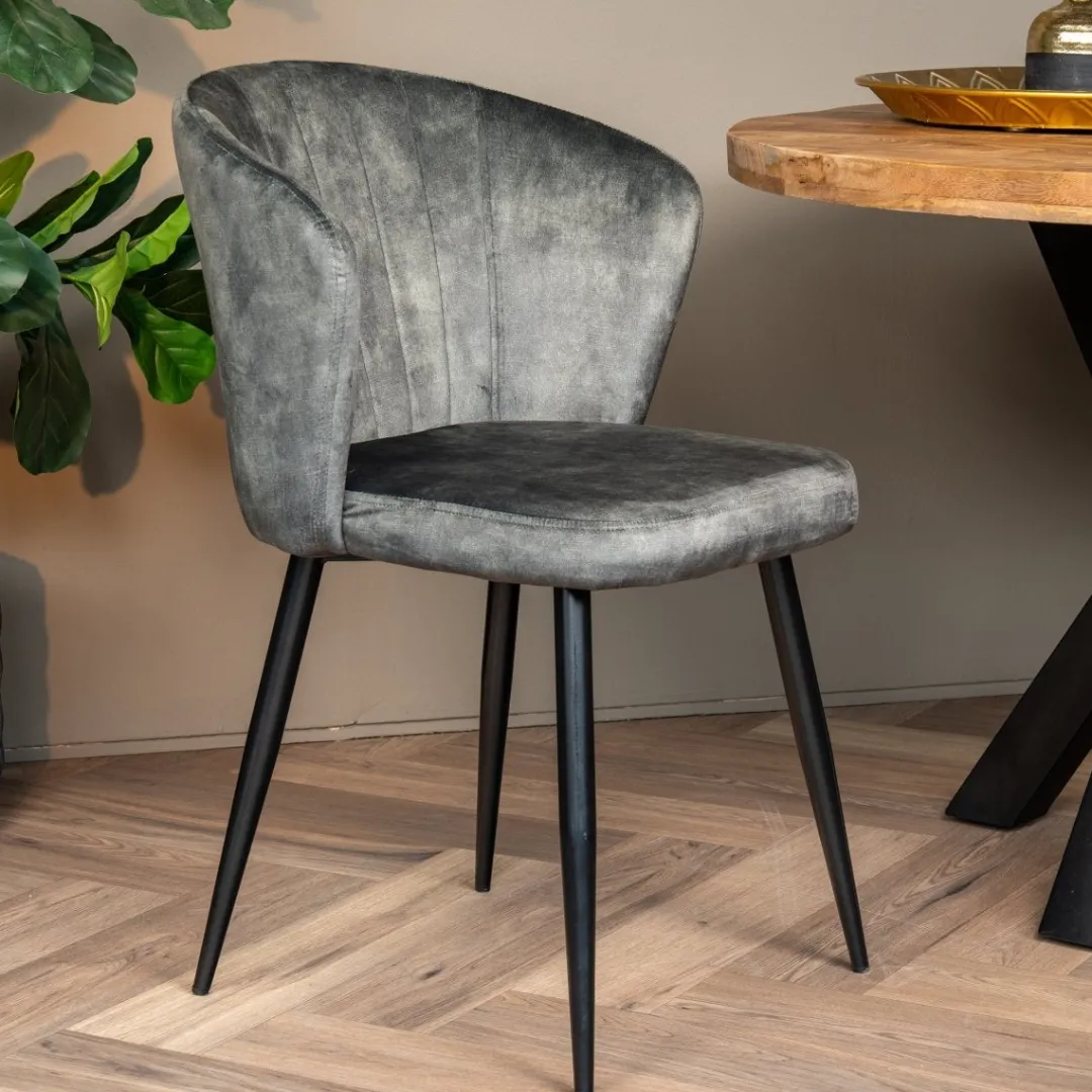 Velvet wordt gemaakt van katoen of zijde. De stof wordt geweven, zodat er kleine, opstaande lusjes ontstaan. Deze lussen worden vervolgens doorgeknipt, waardoor er kleine haartjes ontstaan die erg zacht aanvoelen. Hierdoor krijgt het velvet zijn karakteristieke chique uiterlijk. De poten zijn gemaakt van zwart gepoedercoat metaal.