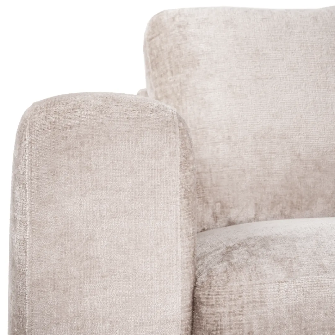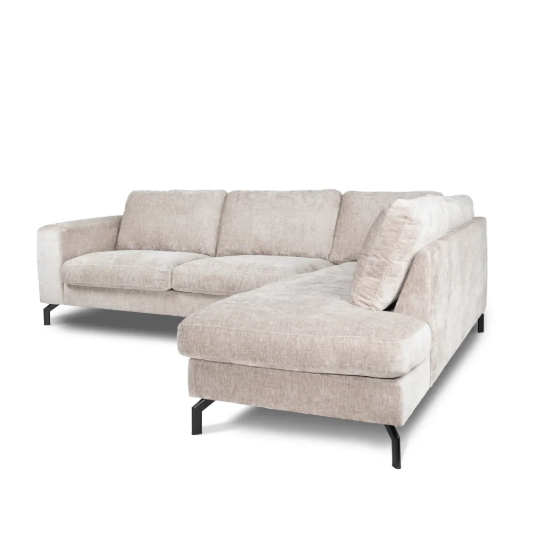 De 4-zits hoekbank Rosalie rechts in champagne is een stijlvolle en comfortabele toevoeging aan je woonkamer. De zachte champagne kleurige bekleding straalt rust en elegantie uit, waardoor de bank moeiteloos past binnen diverse interieurstijlen, van modern tot klassiek.