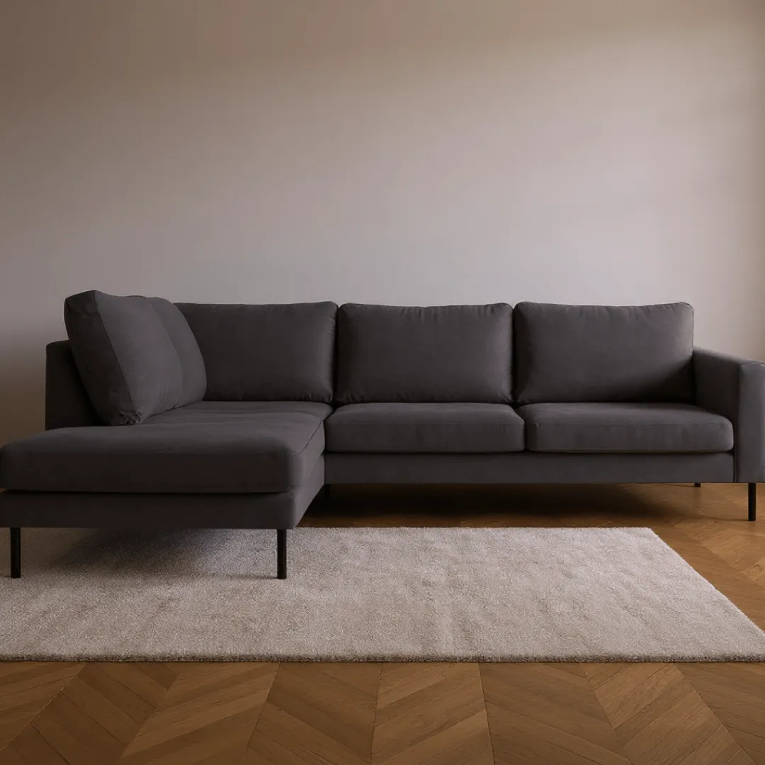 Breng warmte en elegantie in je interieur met hoekbank Sterre. Deze moderne L-vormige bank straalt klasse uit en biedt royaal comfort voor het hele gezin. Dankzij de zachte velours bekleding en het strakke design is Sterre dé eyecatcher in elke woonkamer.