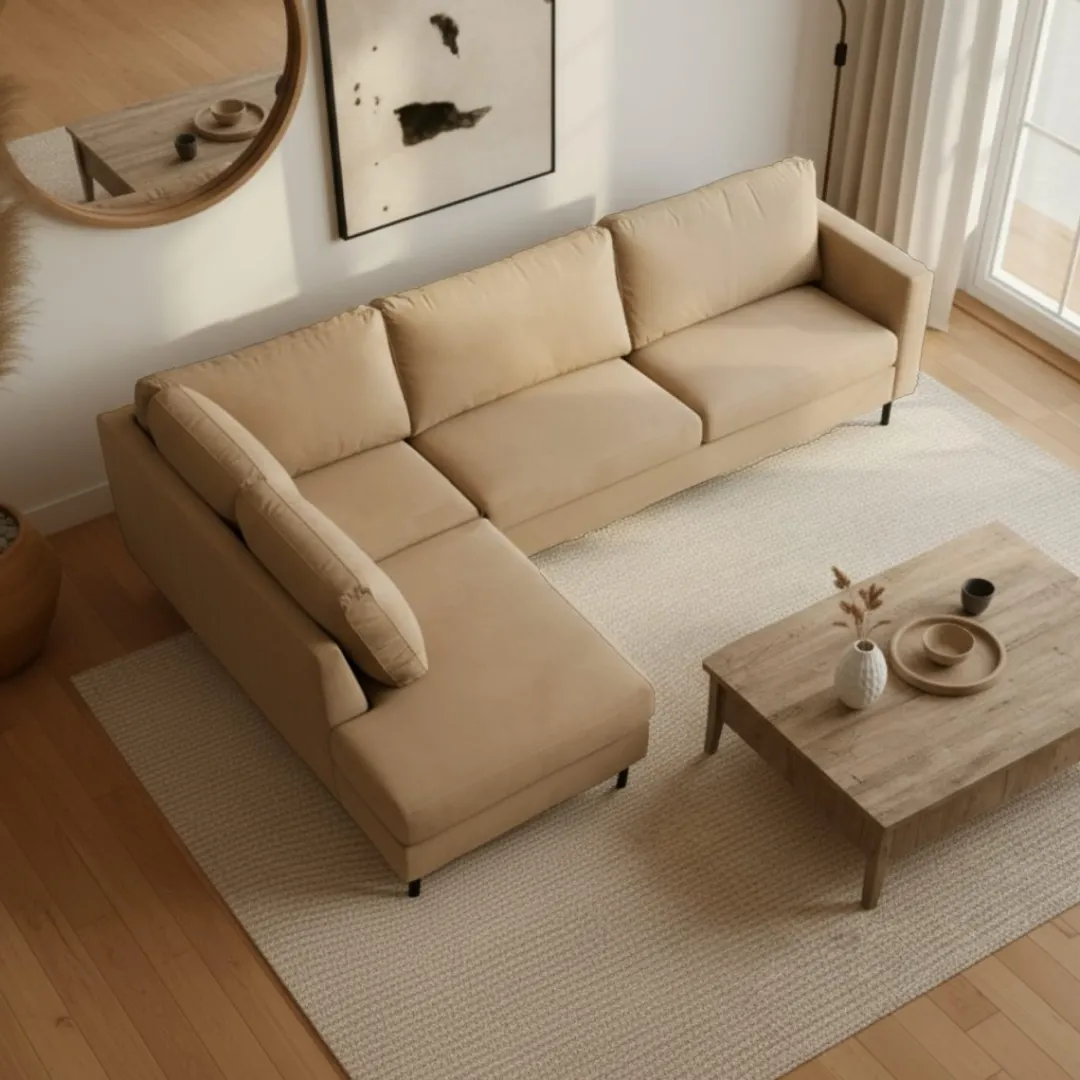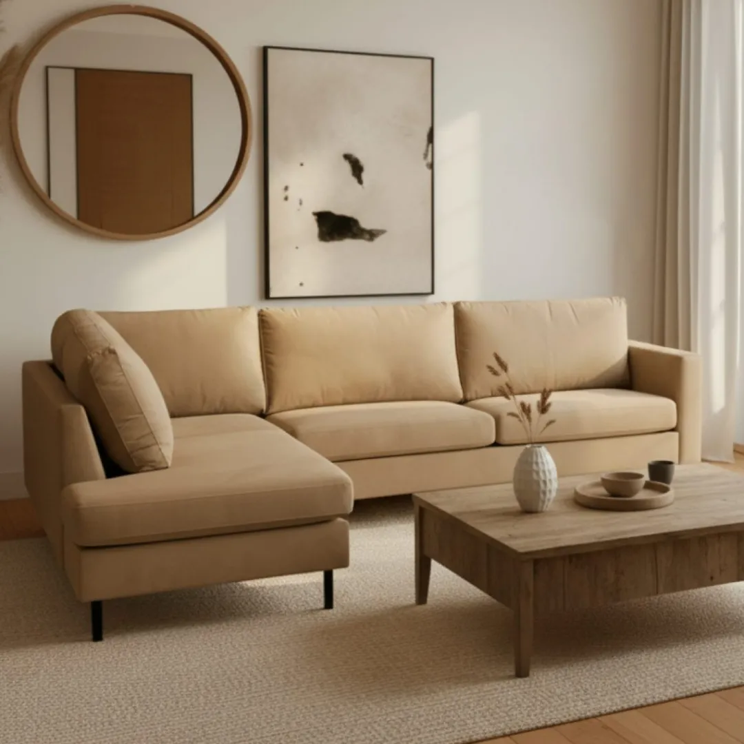 Breng warmte en elegantie in je interieur met hoekbank Sterre. Deze moderne L-vormige bank straalt klasse uit en biedt royaal comfort voor het hele gezin. Dankzij de zachte velours bekleding en het strakke design is Sterre dé eyecatcher in elke woonkamer.