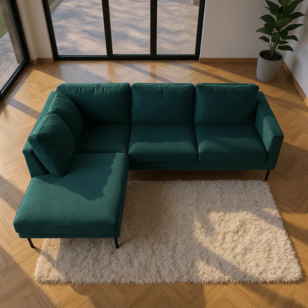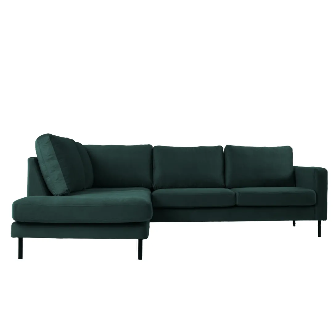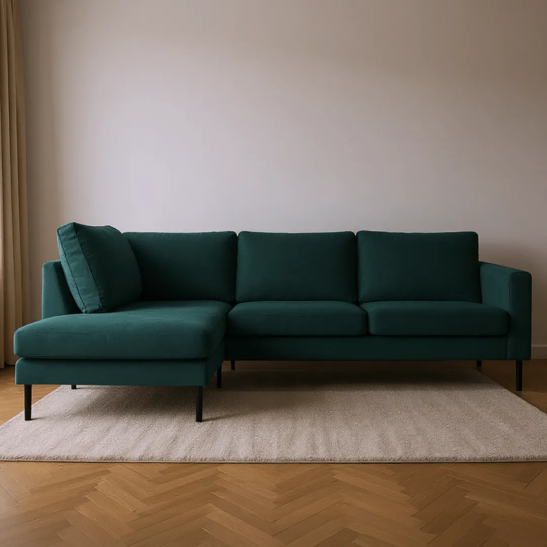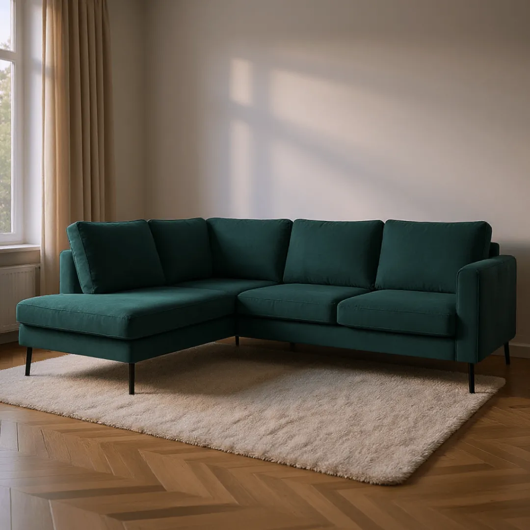 Breng warmte en elegantie in je interieur met hoekbank Sterre. Deze moderne L-vormige bank straalt klasse uit en biedt royaal comfort voor het hele gezin. Dankzij de zachte velours bekleding en het strakke design is Sterre dé eyecatcher in elke woonkamer.