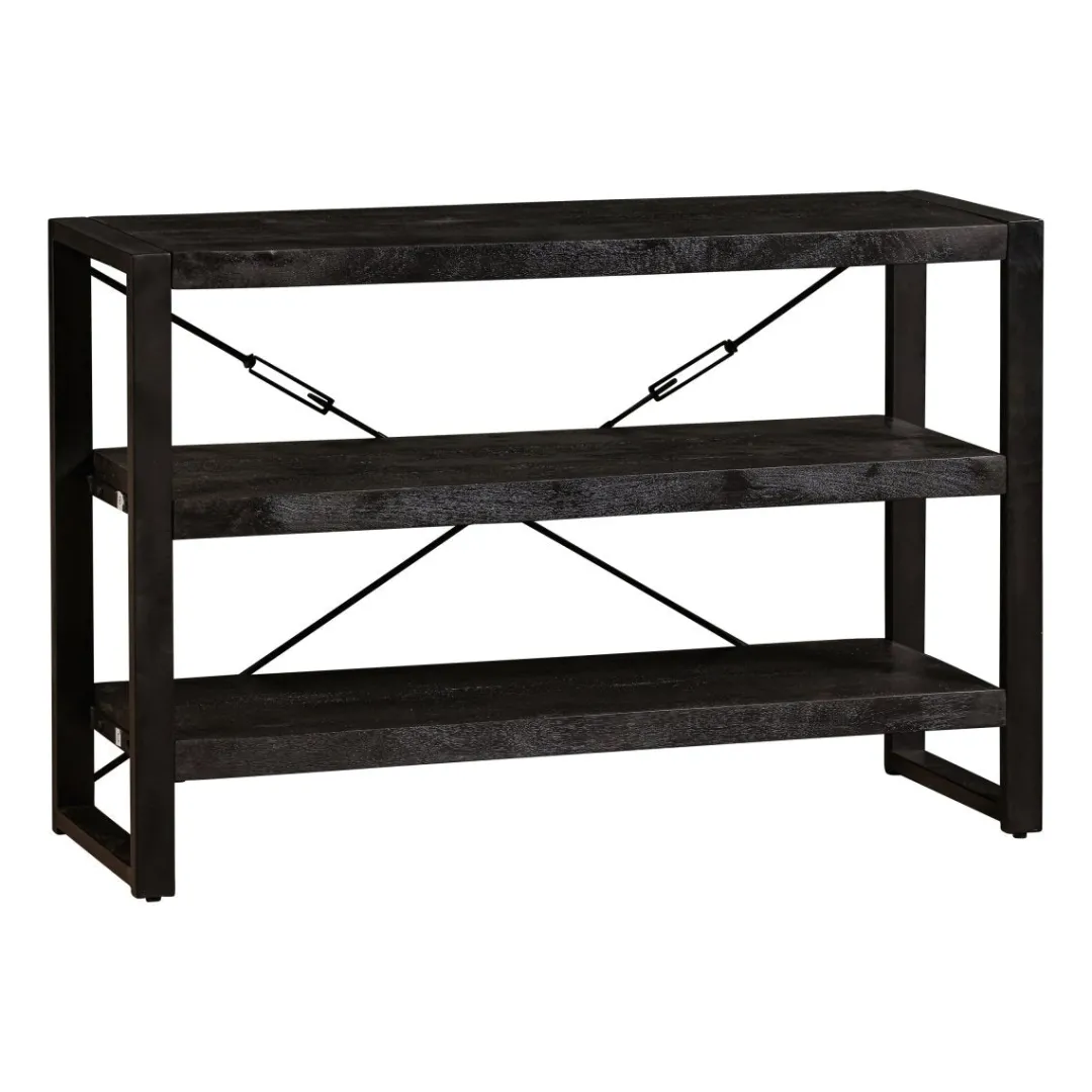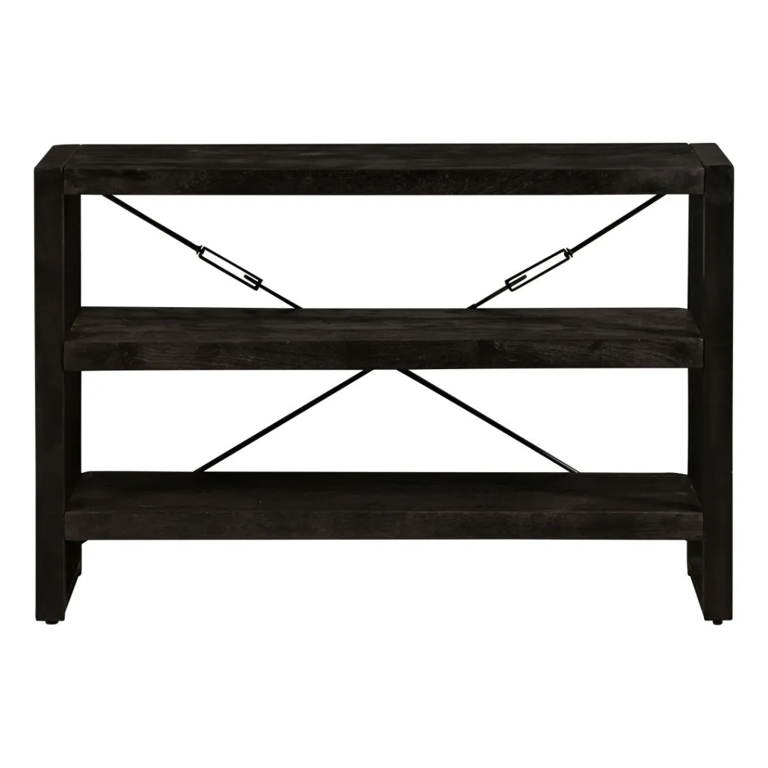 Deze lage boekenkast uit de Britt-collectie neemt door zijn compacte formaat weinig ruimte in, maar biedt genoeg ruimte voor je meest waardevolle boeken of andere spullen. Het zwarte mangohout geeft de kast een stoer karakter en de stalen frames maken het geheel daarnaast helemaal af. Door de open achterkant leent het meubel zich ook goed als TV meubel.