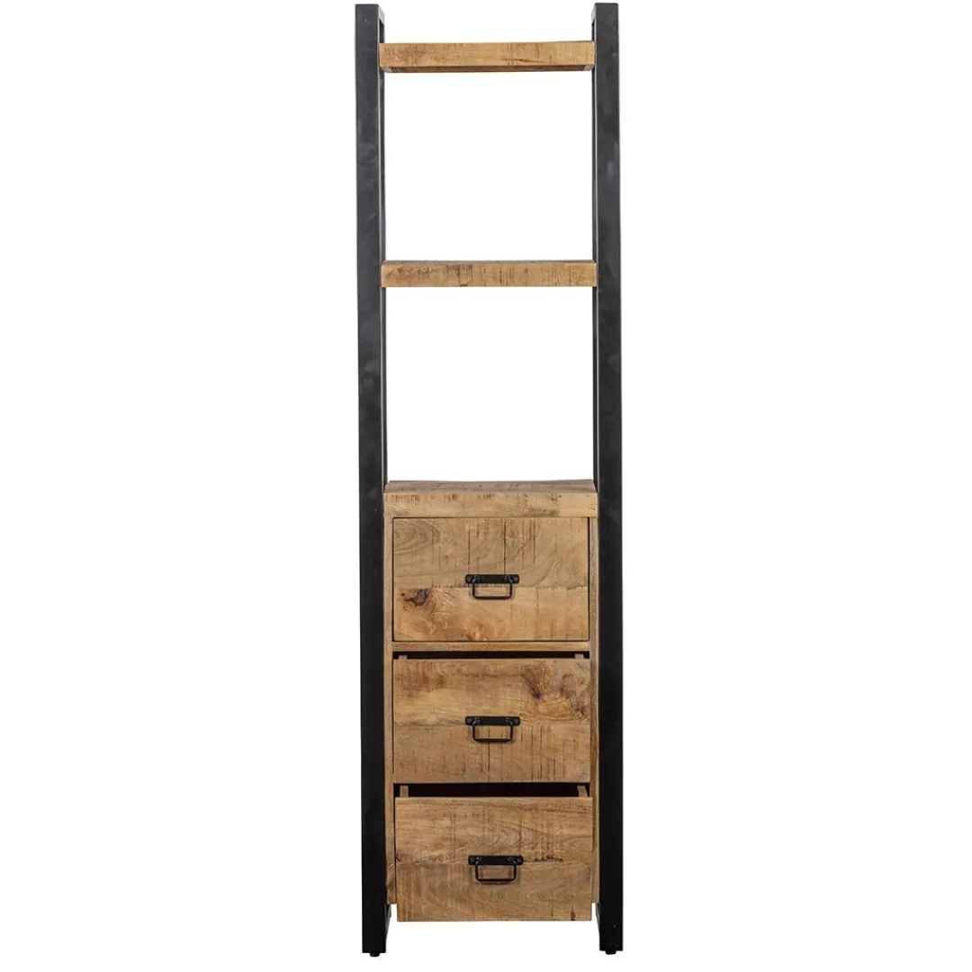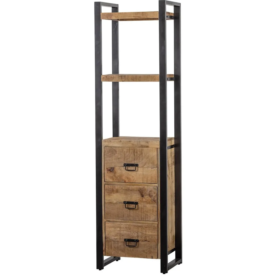 Een smalle, maar stoere kast waar door de compacte vorm altijd wel een plekje voor te vinden is. De kast is misschien niet breed, maar heeft alsnog veel opbergruimte door de twee open vakken en de drie lades.