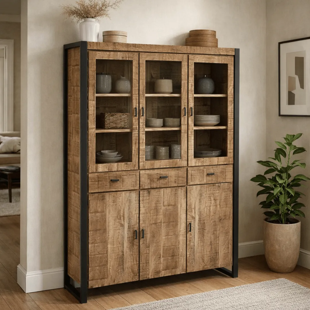 Deze kast heeft in totaal zes deurtjes, waarvan er drie achter glas zitten, plus drie praktische lades. Hiermee kan je al je spullen netjes en georganiseerd opbergen, terwijl je tegelijkertijd een paar mooie items tentoon kan stellen.