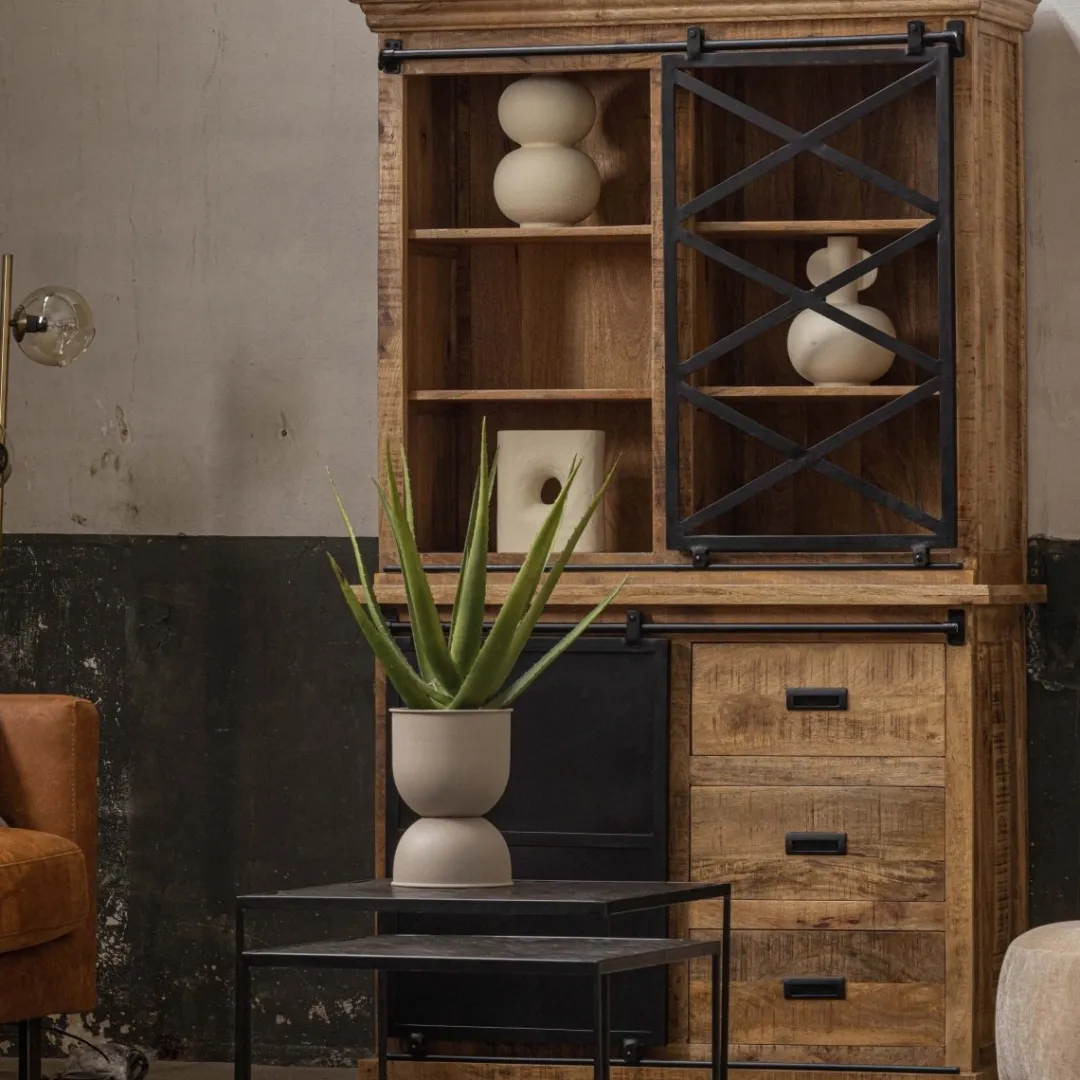 Over het massieve mangohout worden meerdere lagen houtolie en een blanke, natuurlijke bijenwas aangebracht om het hout te beschermen tegen vocht, vuiligheid en kringen. Het frame van de glazen schuifdeur, de onderste schuifdeur en de handgrepen zijn allemaal gemaakt van zwart gepoedercoat metaal.