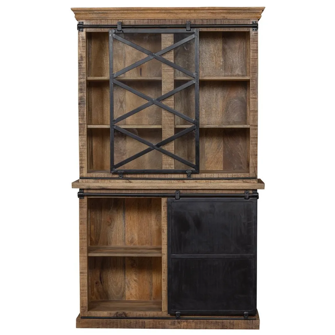 Een fraaie buffetkast zoals deze wilt toch iedereen wel? De kast heeft een stoer uiterlijk door de combinatie van het mangohout met de zwartmetalen accenten, waardoor de kast in elke ruimte zal opvallen! De bovenkant bevat zes vakken om het servies te bewaren, waarvan je zelf kan bepalen welk deel je door de glazen schuifdeur afschermt. De onderkant bevat twee vakken achter een stalen schuifdeur met daarnaast drie lades om kleinere gebruiksvoorwerpen op te bergen.