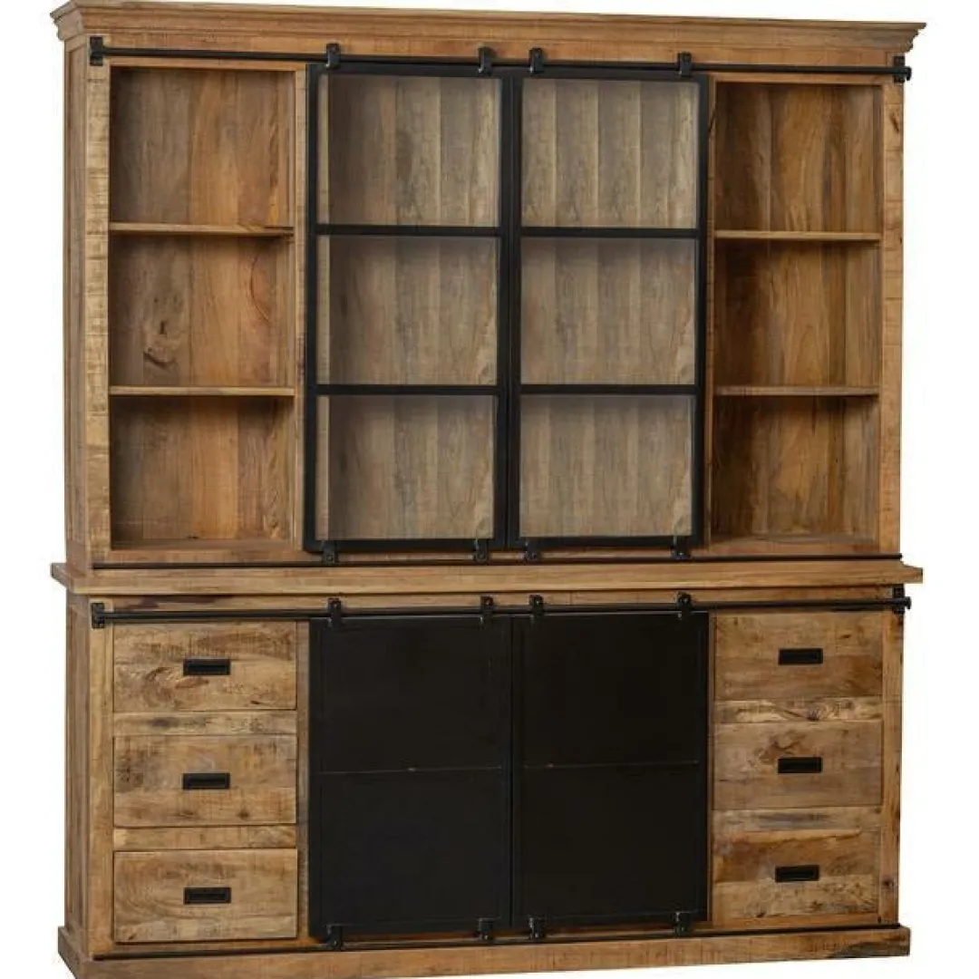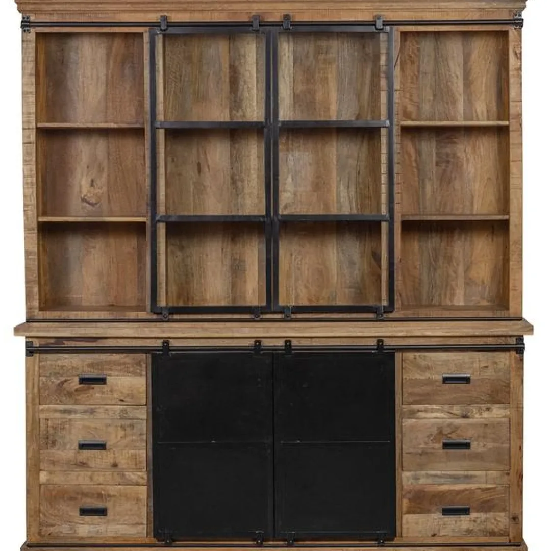 Dit is de kleinste kast uit onze buffetserie met dubbele schuifdeuren aan boven- en onderkant. Dankzij het warme mangohout en het stoere zwarte staal brengt de kast krijgt dankzij het warme mangohout en het stoere zwarte staal een luxe en industriële uitstraling die moeiteloos in elke woning past. Het bovenste gedeelte bevat drie grote en zes kleine vakken om je servies op te slaan, waarvan je zelf kan bepalen welke door de twee glazen schuifdeuren beschermd moeten worden. In het onderste gedeelte vind je zes lades en twee vakken achter de stalen schuifdeuren om allerlei spulletjes op te bergen.