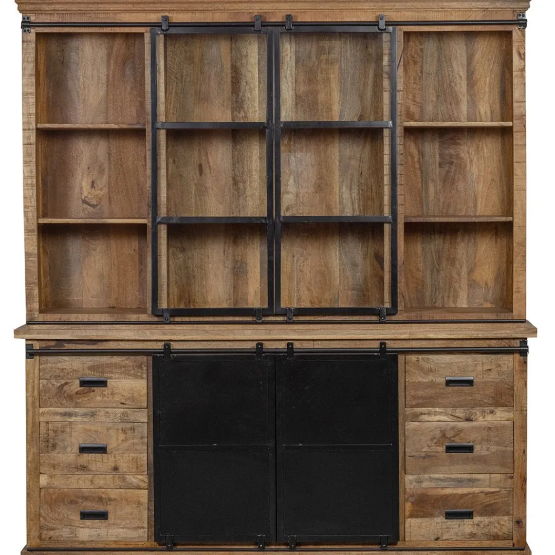 In een stoere, opvallende buffetkast zoals deze zal je serviescollectie nog beter te zien zijn! Door het warme mangohout zal je servies ten alle tijden voor iedereen zichtbaar zijn en de zwartmetalen accenten geven de kast zijn industriële karakter. De bovenkant heeft twee schuifdeurtjes die ervoor zorgen dat een deel van het servies ook nog eens beschermd wordt. Het onderste gedeelte bevat veel ruimte om allerlei spulletjes op te bergen in de zes lades of in de twee vakken achter de stalen schuifdeuren.