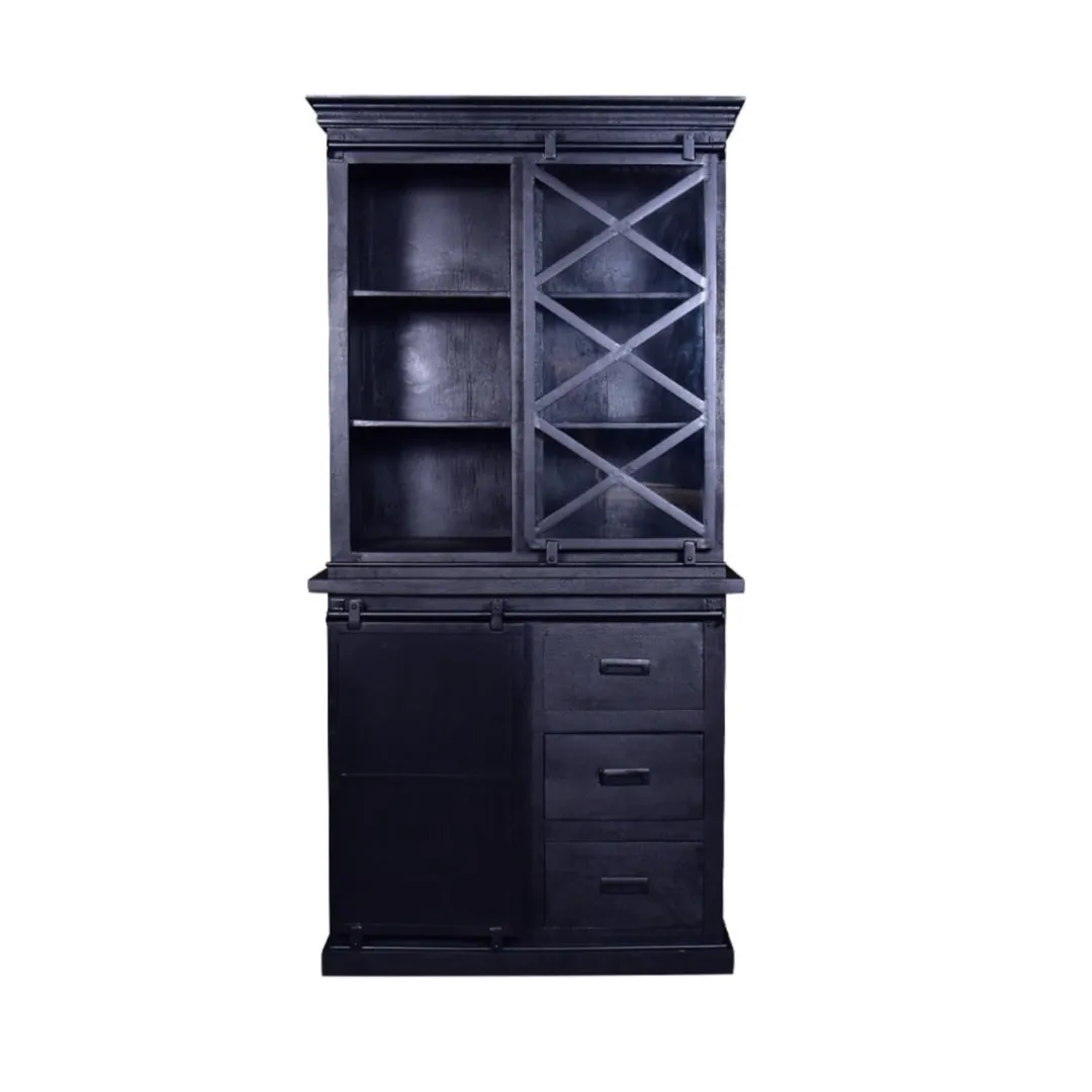 Onze Denver-buffetserie is ook in het zwart verkrijgbaar wat de keuze alleen nog maar moeilijker maakt! Deze fraaie kast van zwart mangohout en metaal werkt uitstekend samen met de rest van je meubilair en past met zijn formaat ook nog eens in elke ruimte! De bovenkant bevat drie grote vakken en door de schuifdeur met x-frame voor het raam kan je zelf bepalen wel deel afgeschermd moet worden. Aan de onderkant is er voldoende ruimte om accessoires op te bergen in de drie lades en in de open vakken achter de stalen schuifdeur.