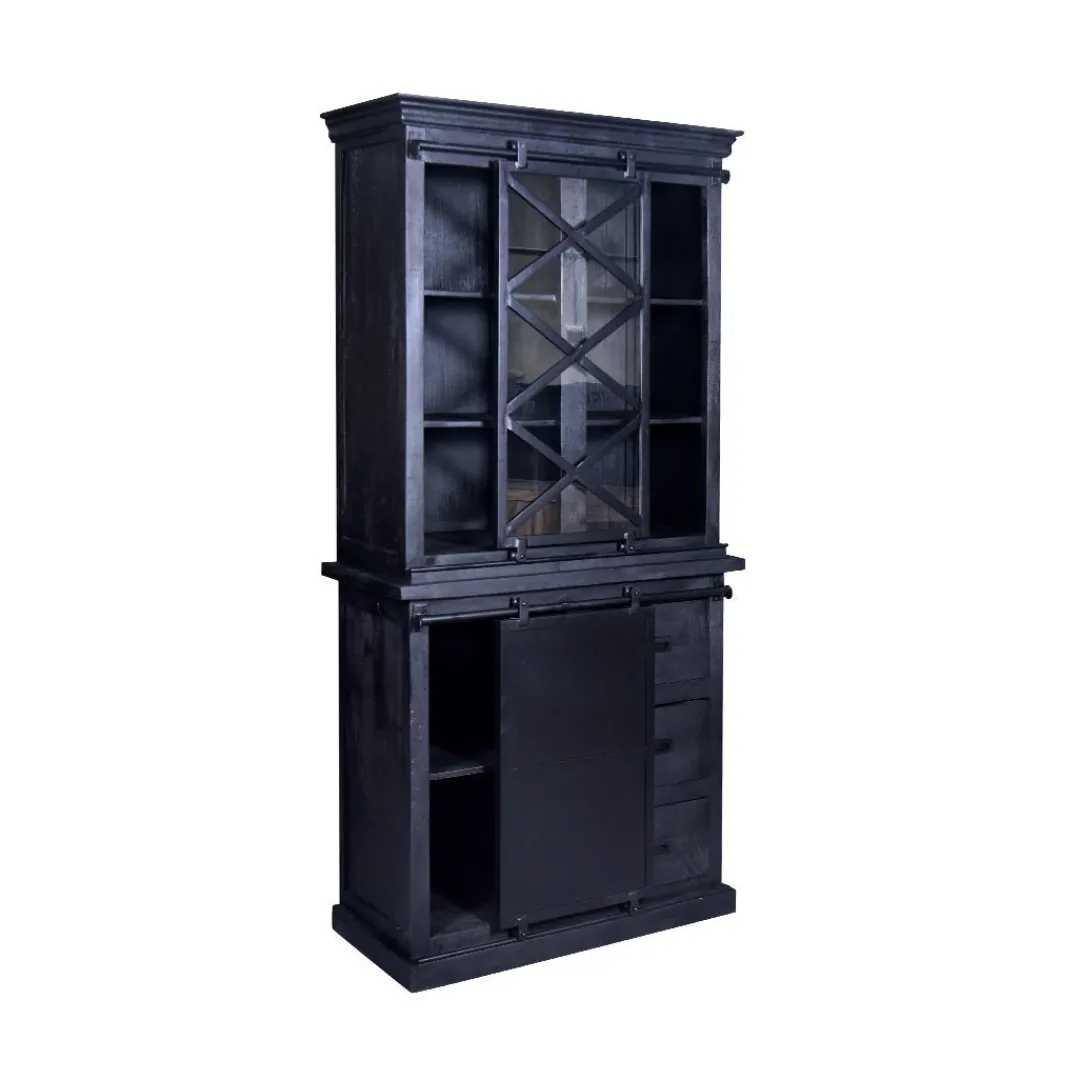 Het mangohout is massief en is eerst gezandstraald, waarna het behandeld wordt met zwarte verfbeits en tenslotte wordt afgewerkt met een donkere, natuurlijke bijenwas om het hout te beschermen tegen vocht, vuiligheid en kringen. Het frame van de glazen schuifdeur, de onderste schuifdeur en de handgrepen zijn allemaal gemaakt van zwart gepoedercoat metaal.