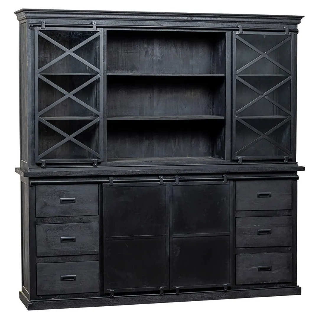 Deze stijlvolle zwarte buffetkast is zowel 220 cm breed als 220 cm hoog. Door de combinatie van het zwarte mangohout met het zwarte metaal, straalt het echte luxe uit en zal het servies nog beter te zien zijn! Het bovenste gedeelte bevat zes kleinere vakken aan de zijkanten en drie grote vakken in het midden. Je kan een deel van het servies eenvoudig afschermen dankzij de dubbele glazen schuifdeur met x-frame voor de ramen. Het onderste gedeelte bevat zes lades en twee grote vakken achter de stalen schuifdeuren, waarin voldoende ruimte is om allerlei eigendommen te bewaren.