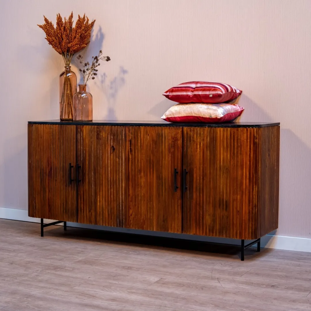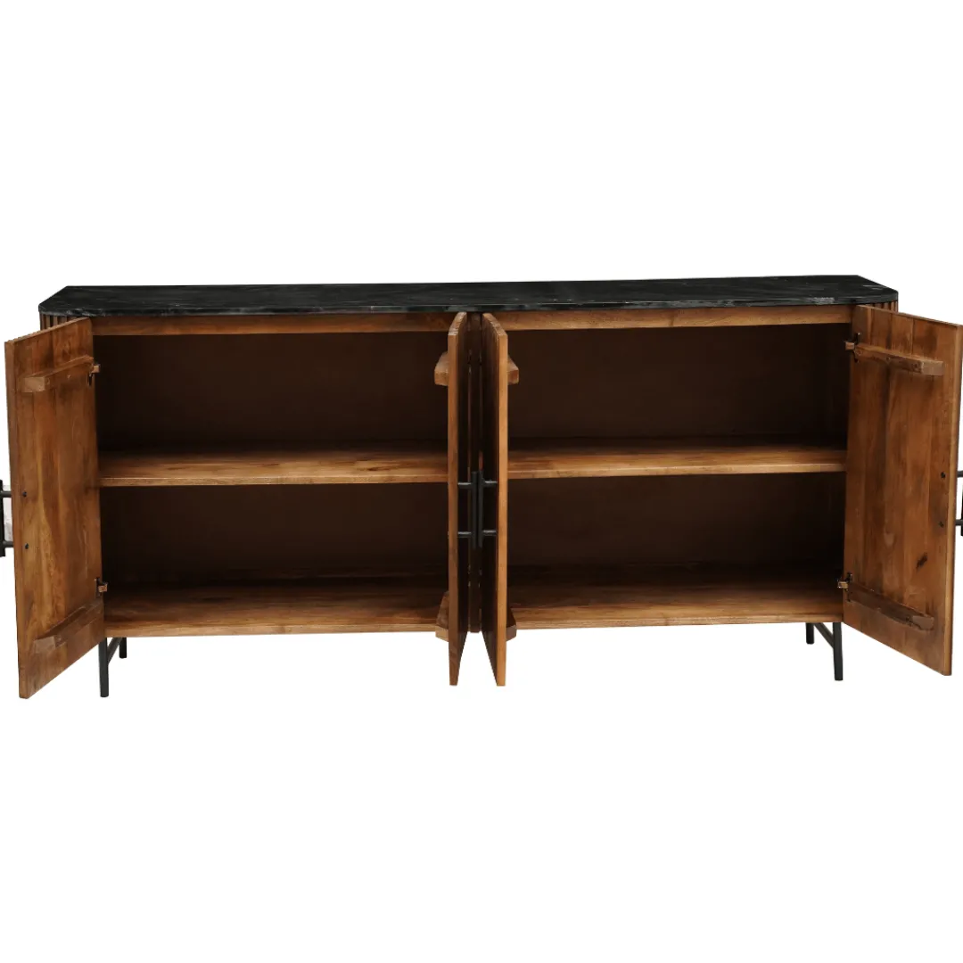 Het dressoir straalt met zijn verfijnde walnootkleurige afwerking, die niet alleen de natuurlijke pracht van het mangohout benadrukt, maar tevens langdurige duurzaamheid waarborgt. Het marmeren bovenblad voegt een vleugje weelde toe aan het geheel, waardoor het dressoir als een ware blikvanger in elke kamer fungeert.