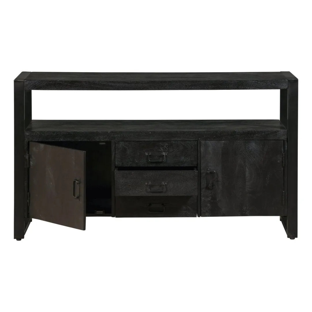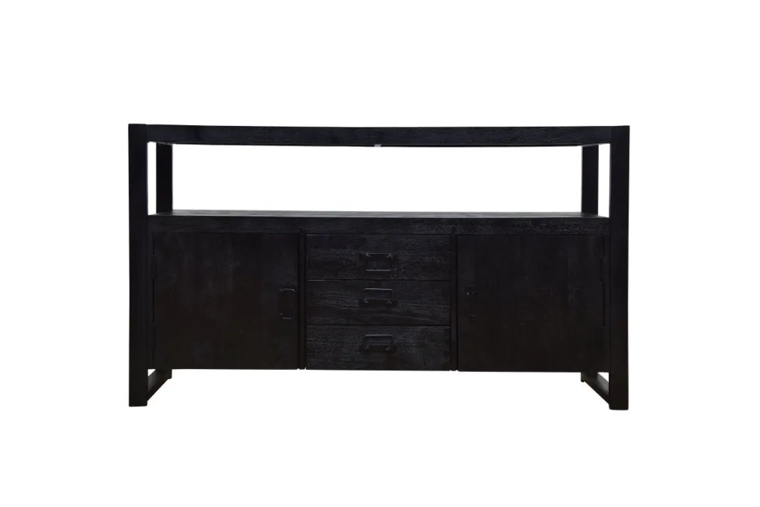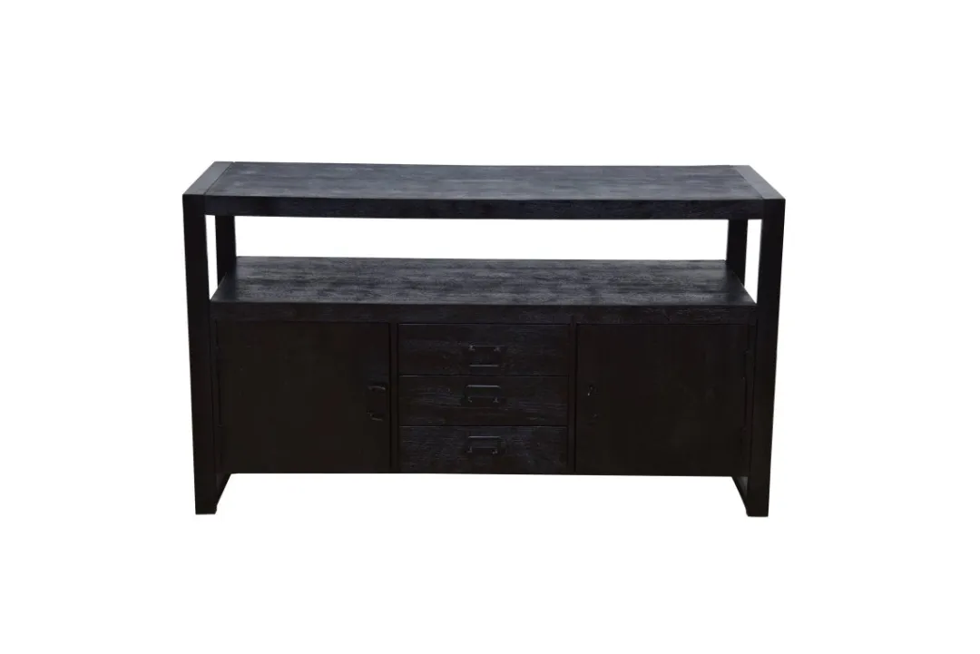 Dressoir Britt is stijlvol en stoer tegelijk. Met twee deurtjes en drie lades daartussenin biedt dit dressoir genoeg ruimte voor zowel wat grotere als kleinere spullen die je liever niet in het zicht hebt liggen. De tussenruimte en het blad kunnen eventueel gebruikt worden voor decoratie om het dressoir helemaal naar jouw smaak te maken. Ook kan het meubel gebruikt worden als TV meubel.