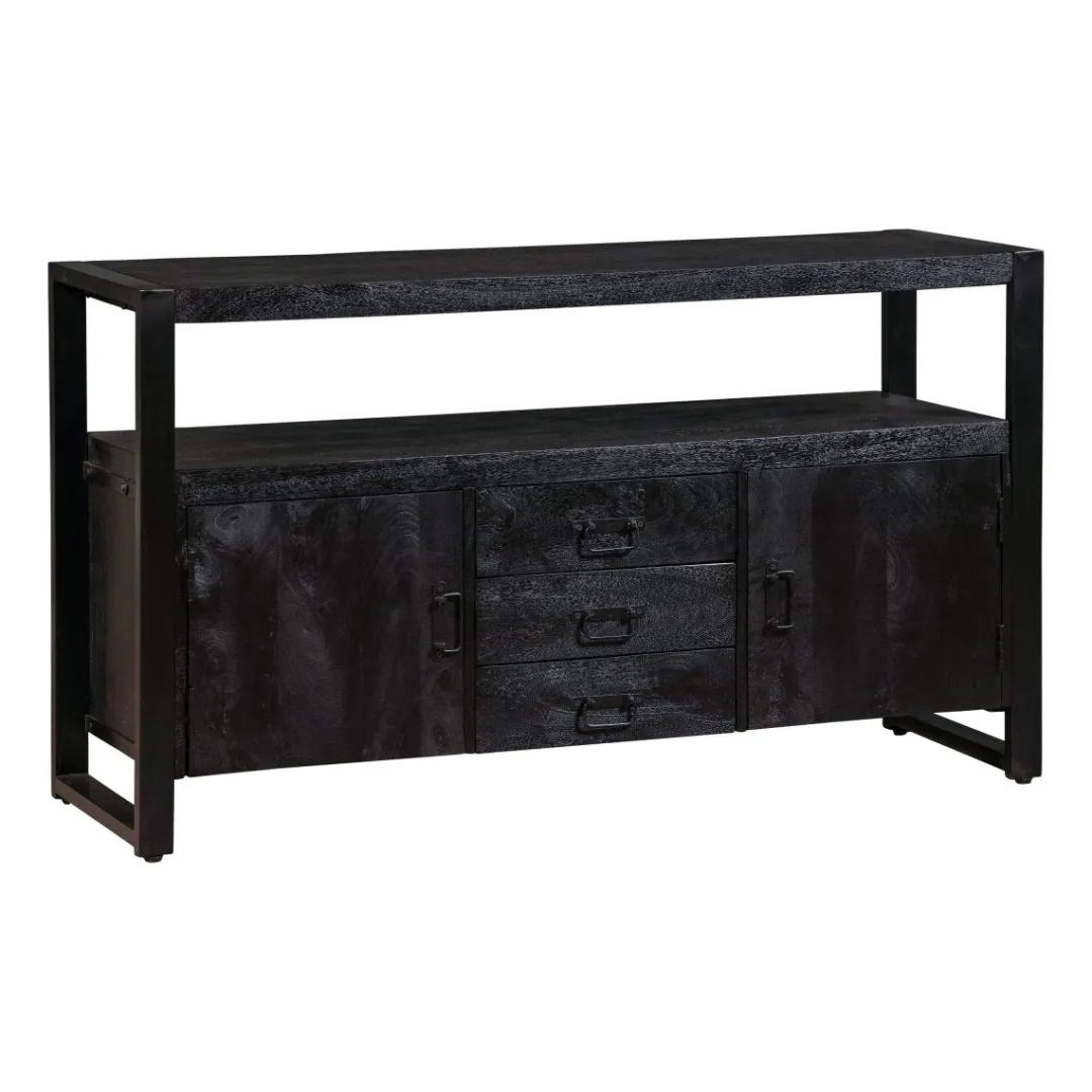 Het massieve mangohout is eerst gezandstraald, vervolgens behandeld met zwarte verfbeits en tenslotte afgewerkt met een donkere, natuurlijke bijenwas om het hout te beschermen tegen vocht, vuil en kringen. De metalen frames en handgrepen zijn behandeld met een zwarte poedercoating.