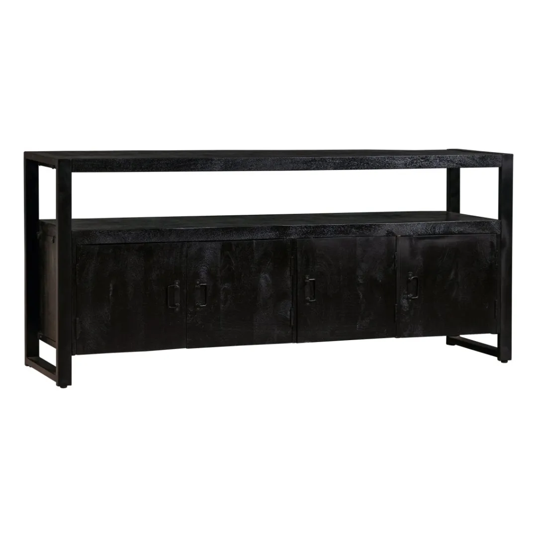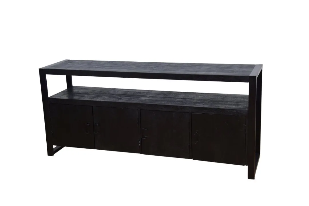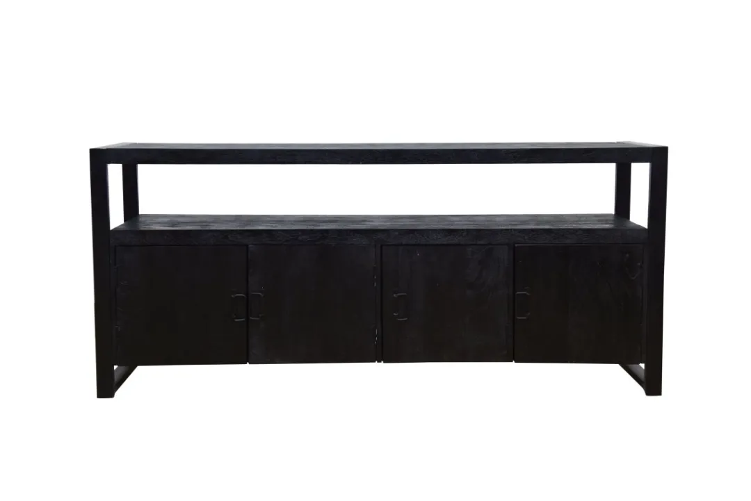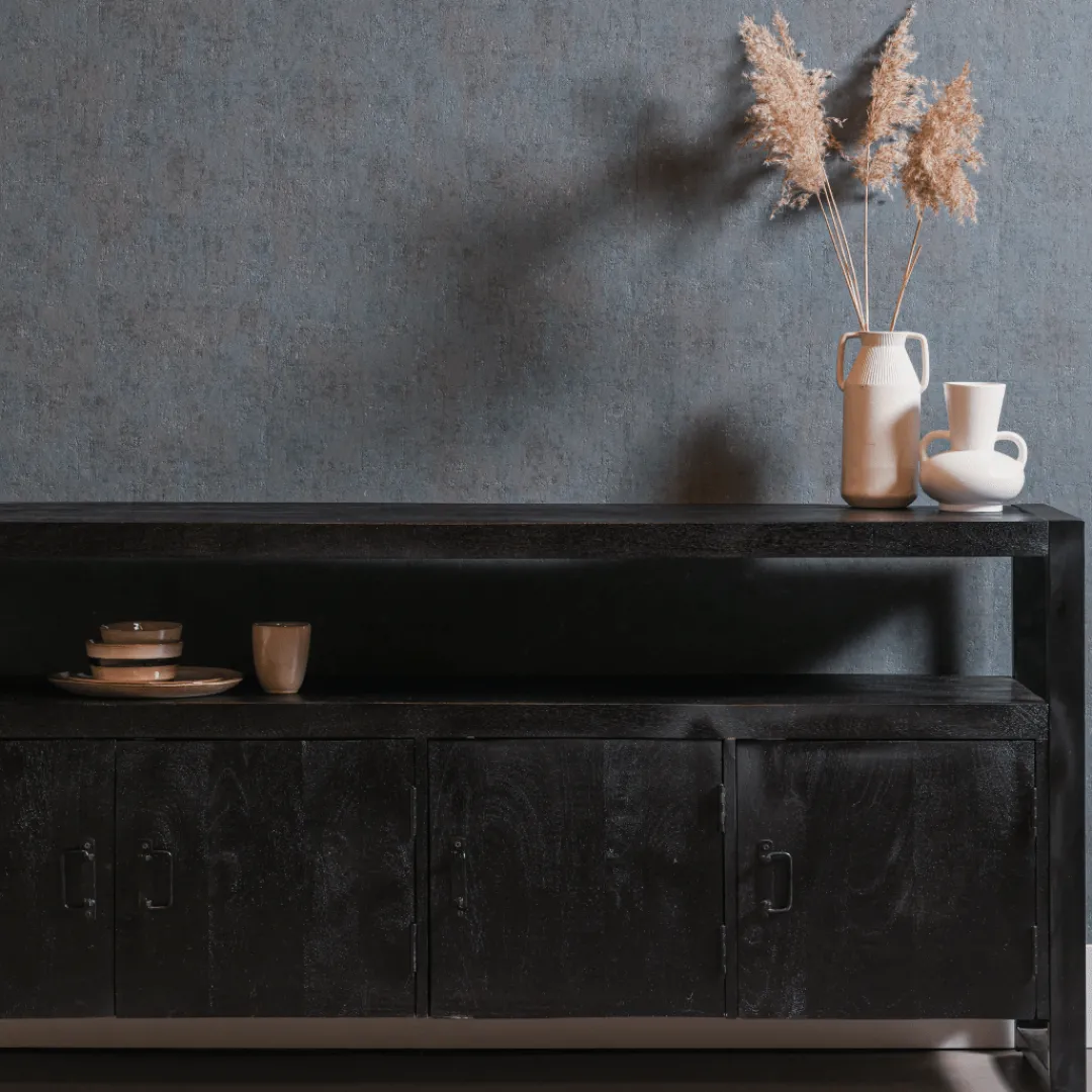 Haal een stoer en robuust meubel in huis met dressoir Britt. De kast van zwart mangohout biedt achter de vier deurtjes voldoende ruimte om van alles op te bergen. De open ruimte kunt onder andere gebruiken voor elektronische apparaten of een leuk kussentje ter decoratie. Verder kan het meubel ook uitstekend gebruikt worden als TV meubel.