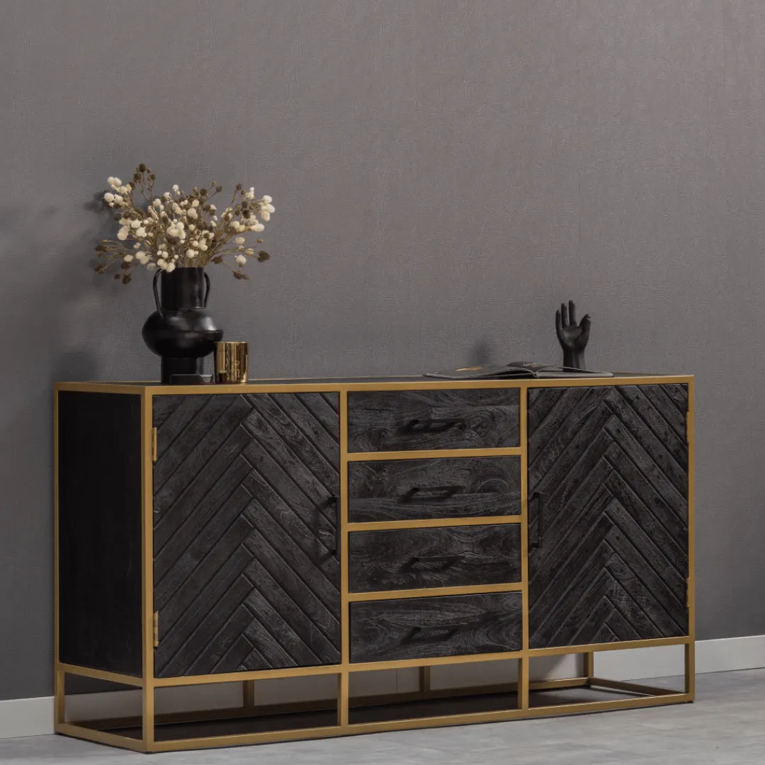 Dit ruimtelijke dressoir uit onze uitgebreide Napels-collectie zal de toon aangeven in elke ruimte. Het dressoir heeft een visgraat patroon met gouden accenten op de deurtjes en heeft daardoor een chique en luxueuze uitstraling. Het dressoir heeft twee deuren en vier lades en biedt voldoende ruimte om jouw spullen in op te bergen.