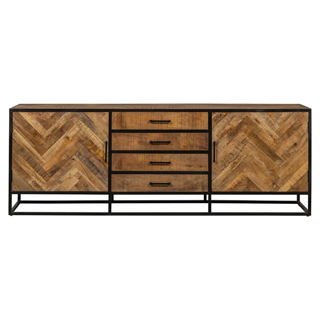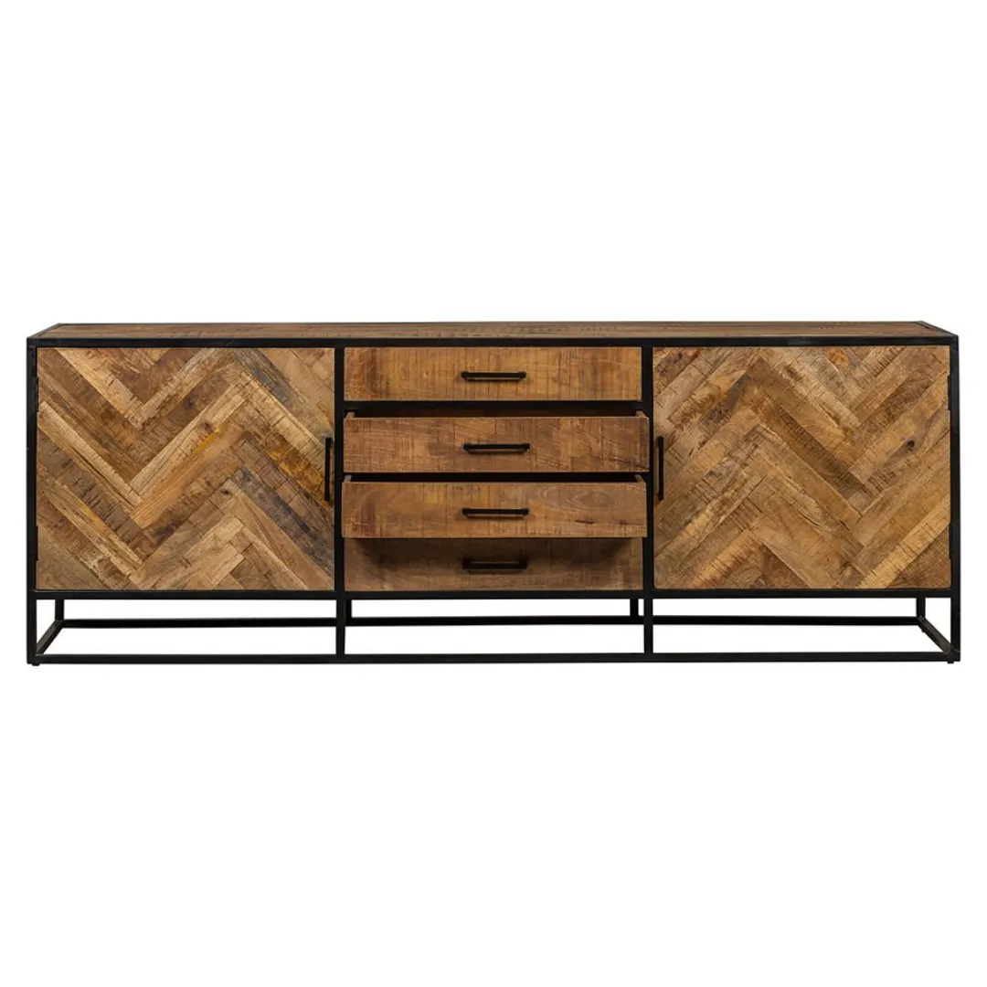 De houten deurtjes zijn voorzien van een visgraatpatroon, wat de kast een stijlvolle uitstraling geeft. Over het massieve mangohout worden meerdere lagen houtolie en een blanke, natuurlijke bijenwas aangebracht om het hout te beschermen tegen vocht, vuiligheid en kringen. Het frame en de handgrepen zijn gemaakt van zwart gepoedercoat metaal.