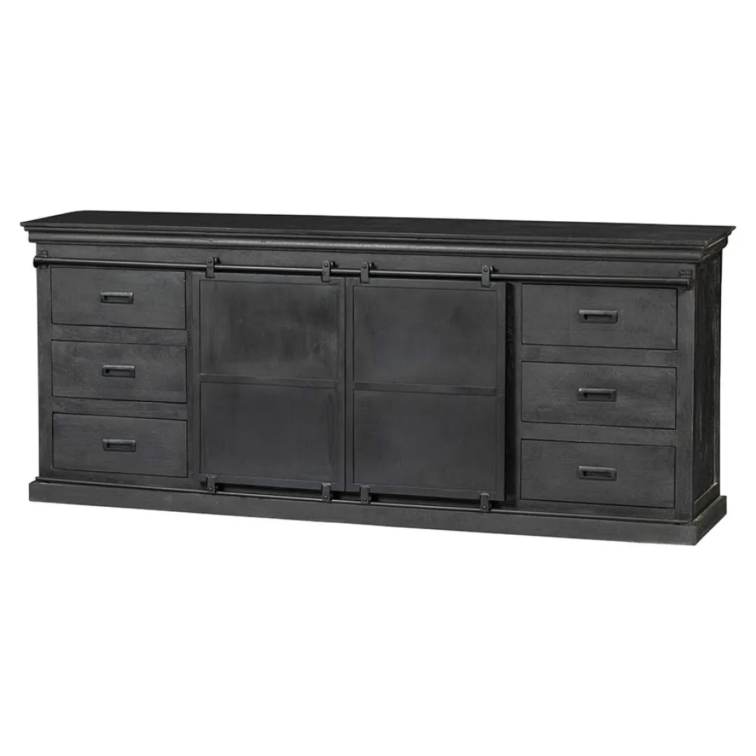 Dit schitterende dressoir Newark Black wil je zeker in je huis hebben staan! Het stoere dressoir zal namelijk in iedere ruimte van de woning direct opvallen door het stijlvolle zwarte mangohout dat samen gaat met de zwartmetalen accenten. De kast beschikt aan iedere zijkant over drie lades om kleinere voorwerpen op te bergen. Achter de stalen schuifdeuren bevinden zich twee ruimere vakken die extra opbergruimte bieden.