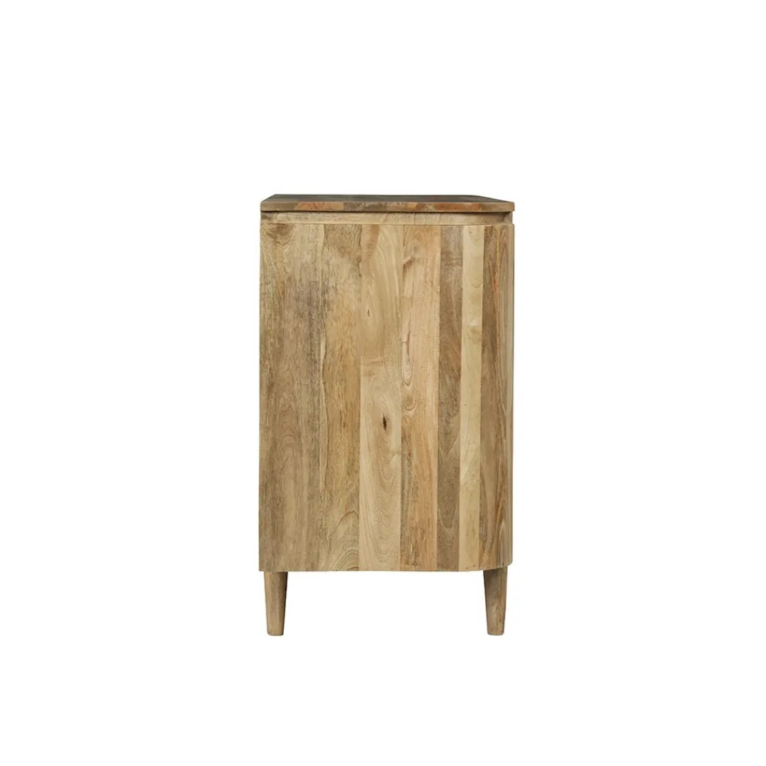 Het dressoir is gemaakt van mangohout waarbij de natuurlijke houtstructuur duidelijk zichtbaar blijft. Dit geeft het meubel een levendig en karaktervol uiterlijk dat goed aansluit bij diverse interieurstijlen.