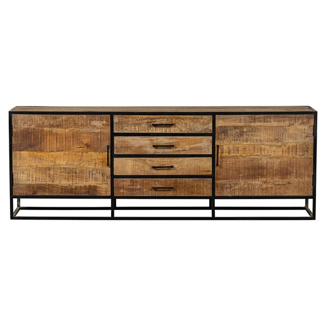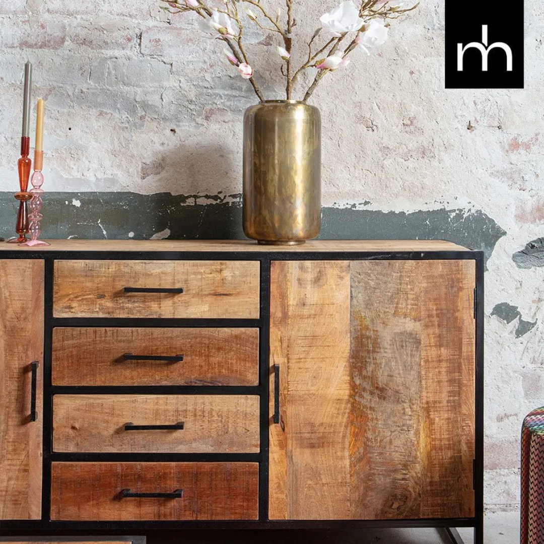 Dit stoere, ruime dressoir uit de San Antonio-collectie is meer dan een gewoon dressoir! Het meubel heeft een krachtig uiterlijk door de combinatie van de stalen elementen met het warme mangohout. Het bovenblad kan gebruikt worden om mooie decoraties te plaatsen zodat de ruimte helemaal naar jouw wens is. De kast beschikt over vier lades en twee brede deurtjes met achter beide deurtjes twee ruime vakken, waardoor er genoeg opbergmogelijkheden zitten in het dressoir.