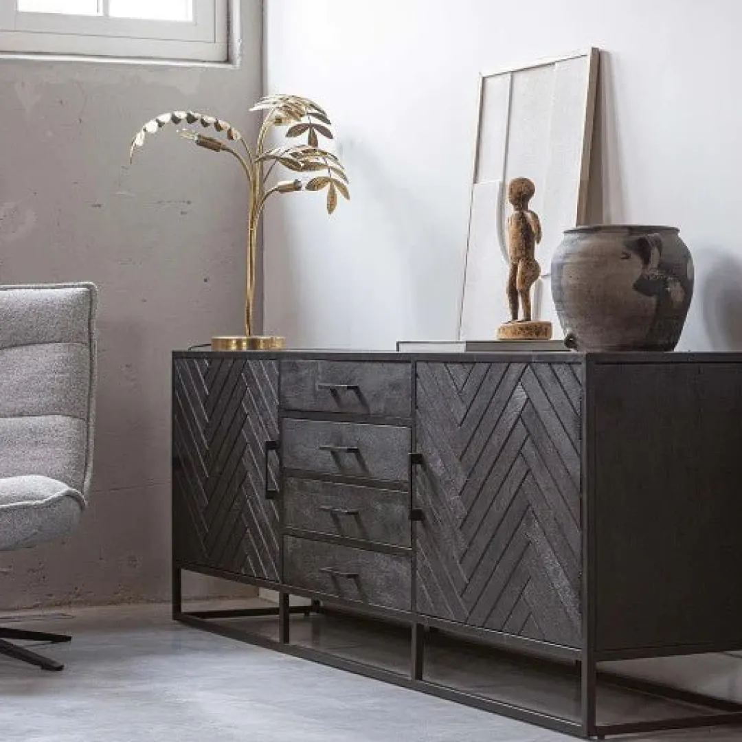 Ben je op zoek naar een zwart dressoir, maar wil je net wat anders dan de andere zwarte dressoirs uit onze collectie? Kies dan voor dit chique, ruimtelijke dressoir met visgraat motief. Verder beschikt het dressoir over vier ruime lades en achter ieder deurtje twee grote vakken om van alles op te bergen. Zo heb je een fantastisch nieuw dressoir en blijft de woning ook nog eens opgeruimd!