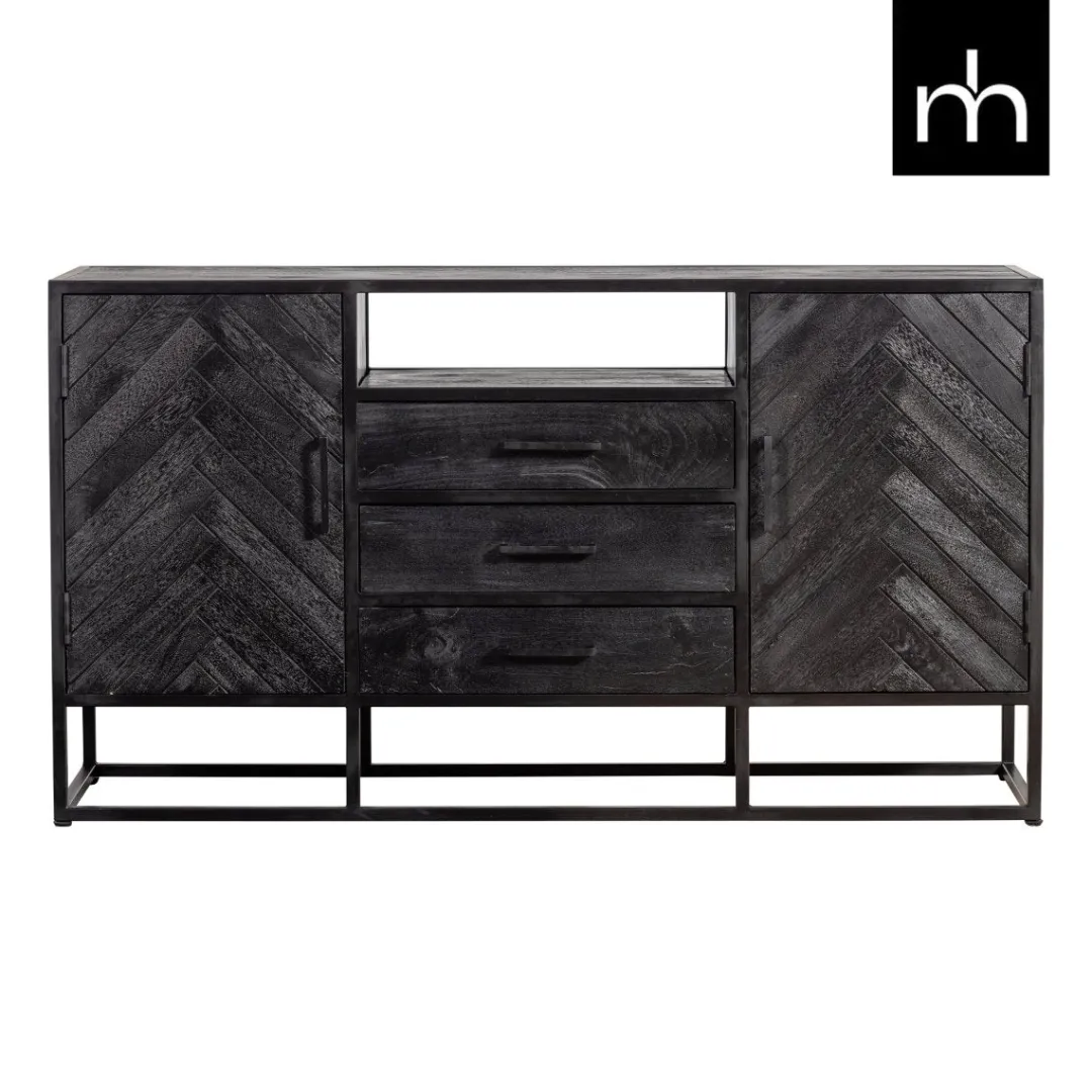 Het massieve mangohout is eerst gezandstraald, daarna behandeld met zwarte verfbeits en tenslotte afgewerkt met een donkere natuurlijke bijenwas, zodat het hout beschermt is tegen vocht, vuil en kringen. Het frame en de handgrepen zijn gemaakt van zwart staal dat is afgewerkt met een zwarte poedercoating.