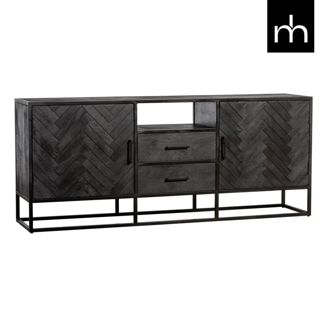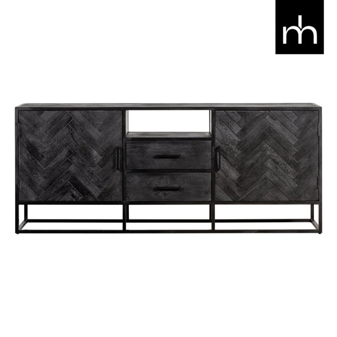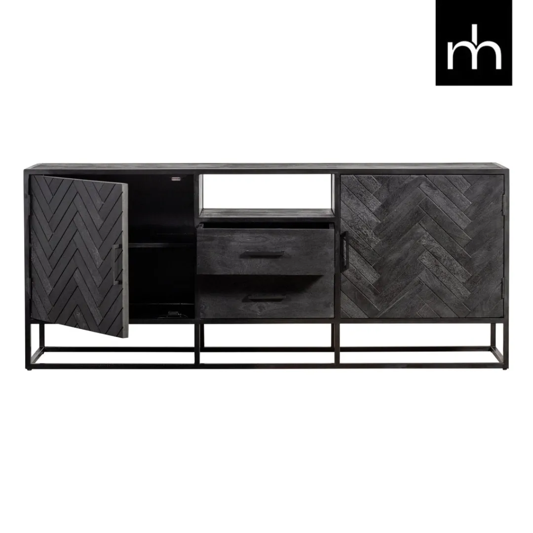 Dit zwarte dressoir uit de Toronto-serie barst van de mogelijkheden. Door het stijlvolle visgraatmotief heeft het meubel een elegante uitstraling. De open onderkant creëert daarnaast een ruimtelijk gevoel. Het meubel beschikt door de twee lades en de ruimtes achter de deurtjes over veel opbergmogelijkheden.