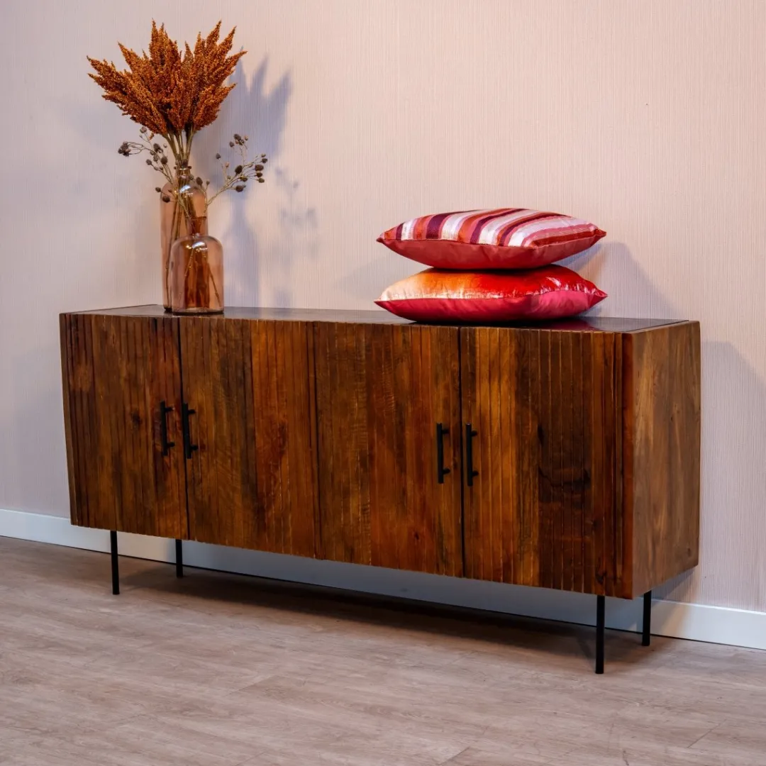 Gemaakt van hoogwaardig mangohout, dat zowel bekend staat om zijn duurzaamheid als natuurlijke schoonheid, onderscheidt dit dressoir zich door zijn prachtige houtnerf en warme tinten.
