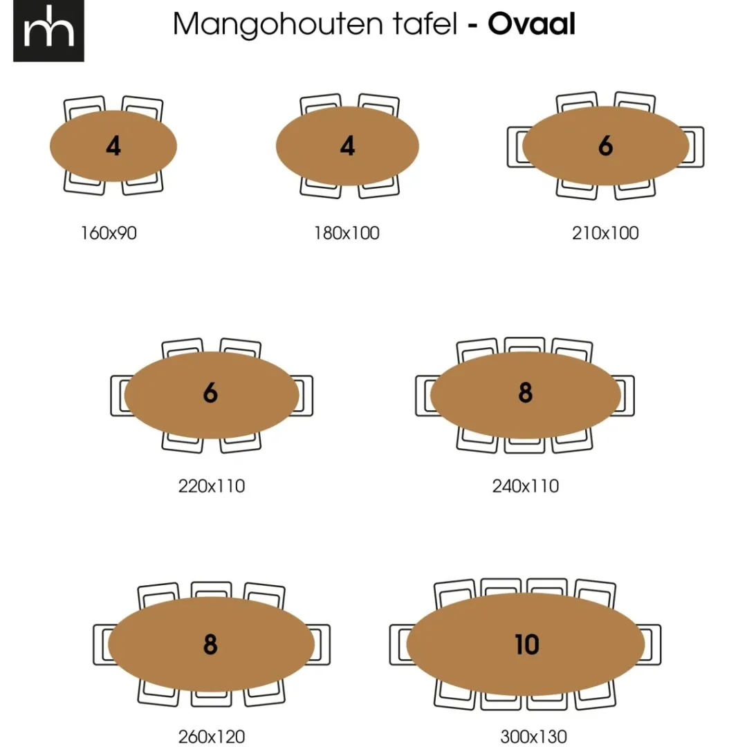 | Style | 160×90 cm (4/6 personen), 180×100 cm (4/6 personen), 210×100 cm (4/6 personen), 220×110 cm (6/8 personen), 240×110 cm (6/8 personen), 260×120 cm (6/8 personen), 300×130 cm (8/10 personen) |