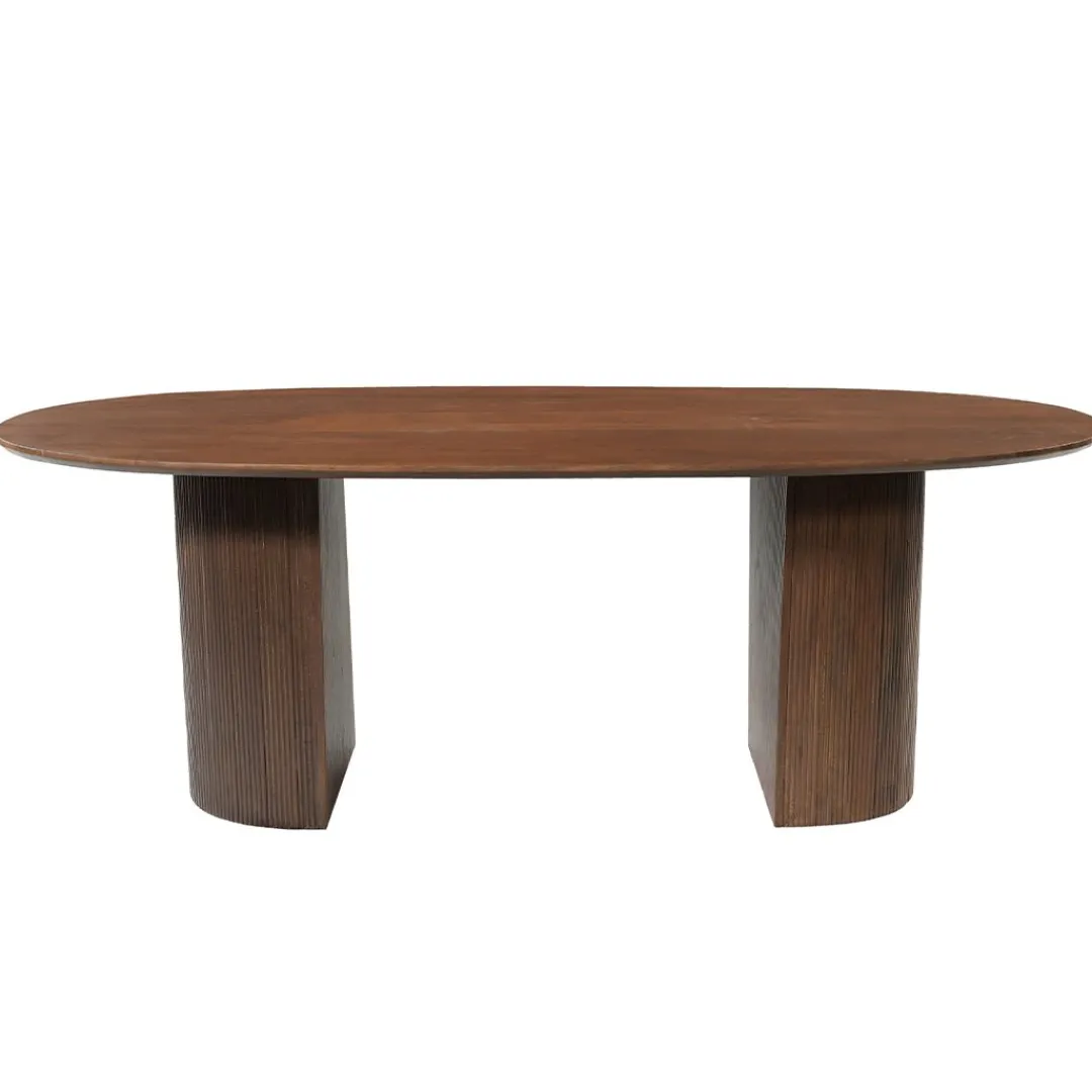 Eettafel Chiara is een tijdloze toevoeging aan je interieur. Het massieve mangohout, afgewerkt met een walnootkleurige laklaag, geeft de tafel een warme en stoere uitstraling. Het ovale blad zorgt voor een moderne touch en maakt de tafel een echte blikvanger in de eetkamer.