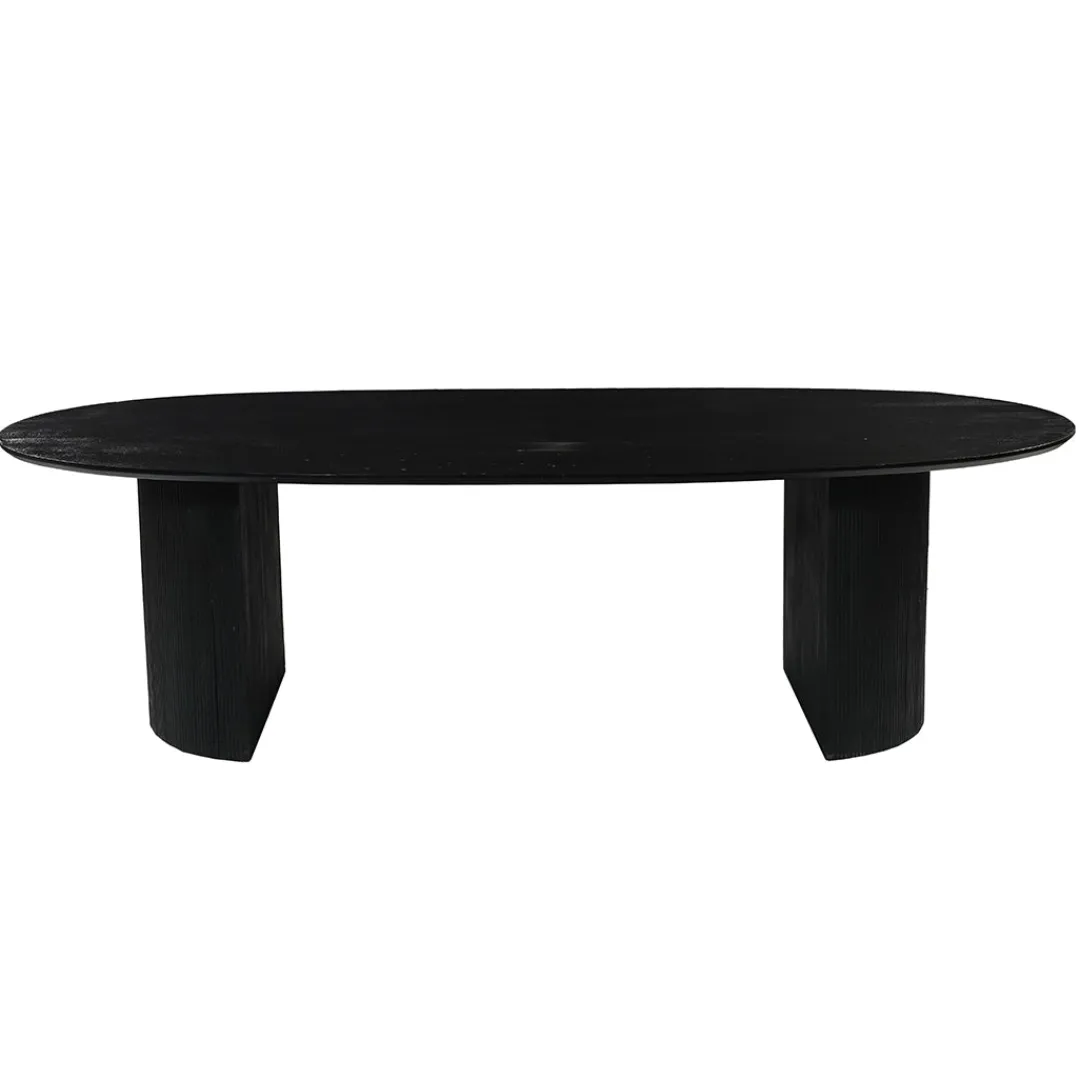 Eettafel Chiara voegt zowel stijl als karakter toe aan je interieur. Het ovale blad van massief mangohout, afgewerkt in een rijke zwarte kleur, zorgt voor een luxe en moderne uitstraling.