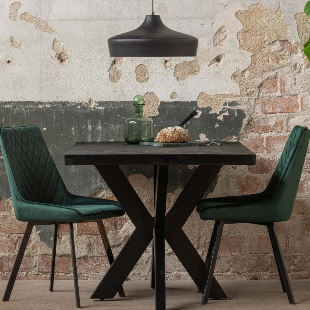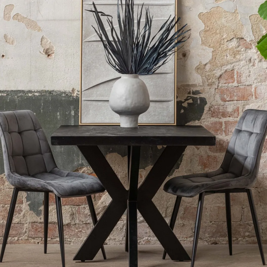 Het mangohout is eerst gezandstraald, waarna het behandeld wordt met zwarte verfbeits en tenslotte wordt afgewerkt met een donkere, natuurlijke bijenwas om het hout te beschermen tegen vocht, vuiligheid en kringen. De matrixpoten zijn gemaakt van zwart gepoedercoat metaal.