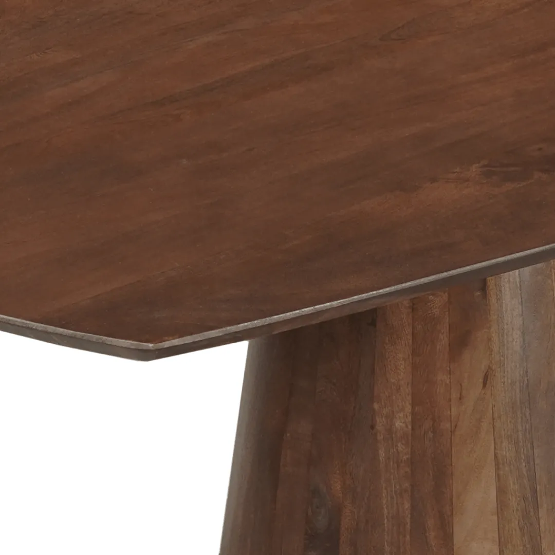 Breng warmte en stijl in je eetkamer met de Eettafel Nova in Deens ovale vorm. Deze prachtige tafel is gemaakt van mangohout en heeft een unieke ronde vorm met een robuuste trompetpoot. Het natuurlijke karakter van het hout geeft elke tafel een eigen uitstraling dankzij de zichtbare nerven en kleurverschillen.