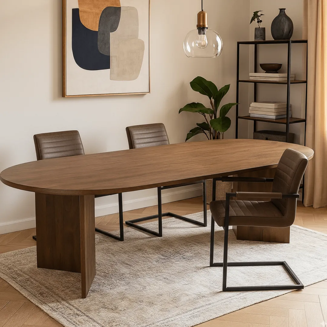 Eettafel Sara is een elegante toevoeging aan je interieur. Gemaakt van massief mangohout en afgewerkt met een walnootkleurige laklaag, straalt de tafel zowel warmte als kracht uit. Het ovale blad zorgt voor een moderne, verfijnde uitstraling die elke eetkamer verrijkt.