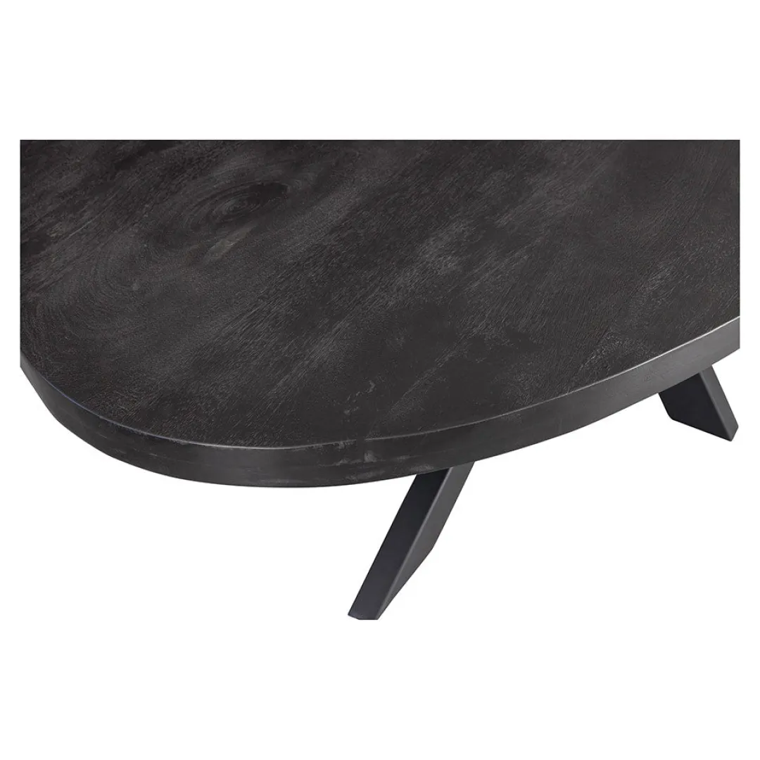 Het mangohout is eerst gezandstraald, waarna het behandeld wordt met zwarte verfbeits en tenslotte wordt afgewerkt met een donkere, natuurlijke bijenwas om het hout te beschermen tegen vocht, vuiligheid en kringen. Het blad met een dikte van 5 cm bestaat uit 3 cm massief mangohout en is met een extra strook van 2 cm aangedikt. De matrixpoten zijn gemaakt van zwart gepoedercoat metaal.