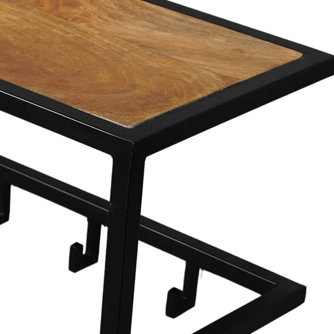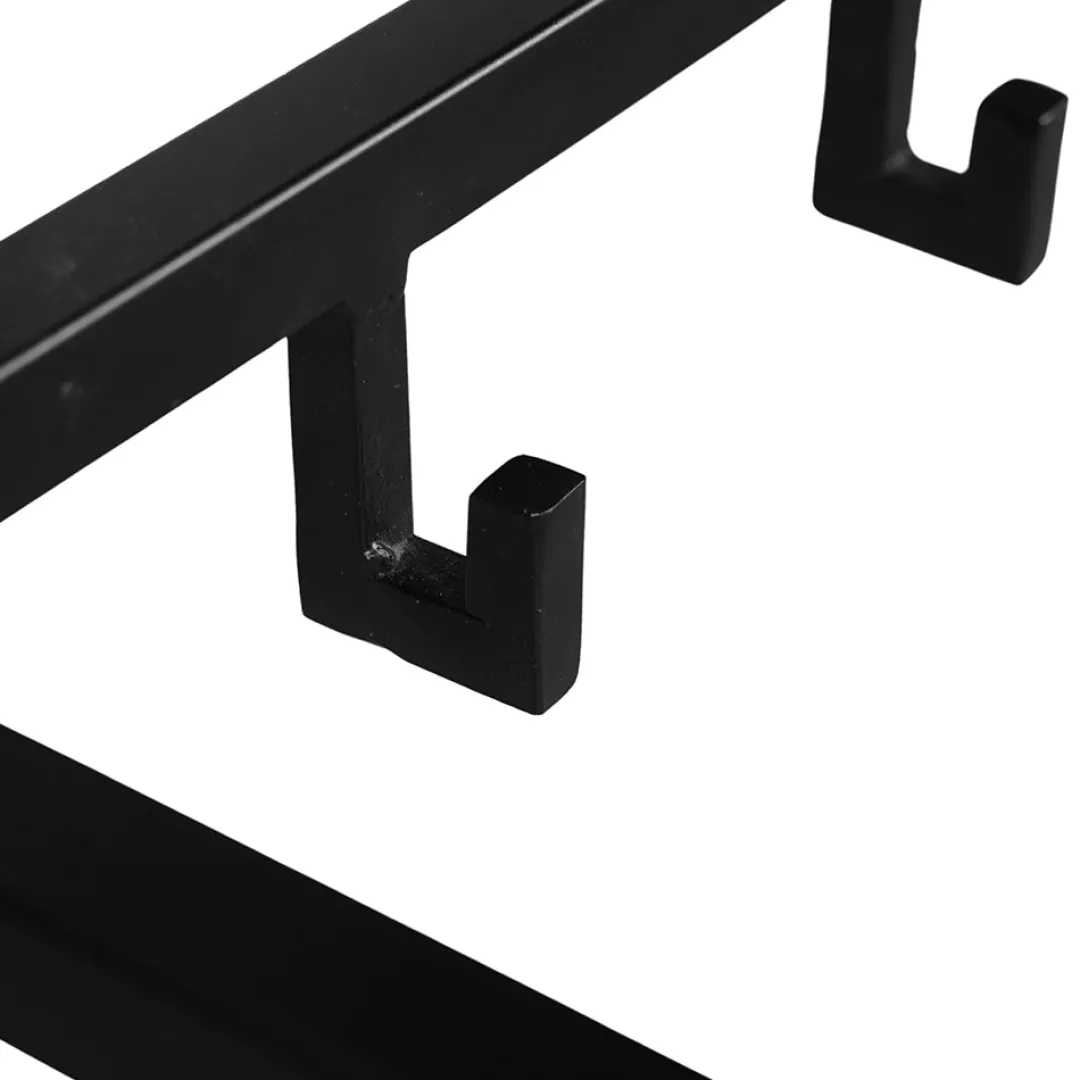 Deze mangohouten kapstok is zowel praktisch als een echte blikvanger met zijn industriële uitstraling. De plank is gemaakt van duurzaam mangohout en biedt voldoende ruimte voor decoratieve items of dagelijkse benodigdheden zoals sleutels en brieven. Het stevige frame en de haakjes zijn vervaardigd van gepoedercoat zwart metaal, wat zorgt voor een modern contrast en een robuuste constructie.
