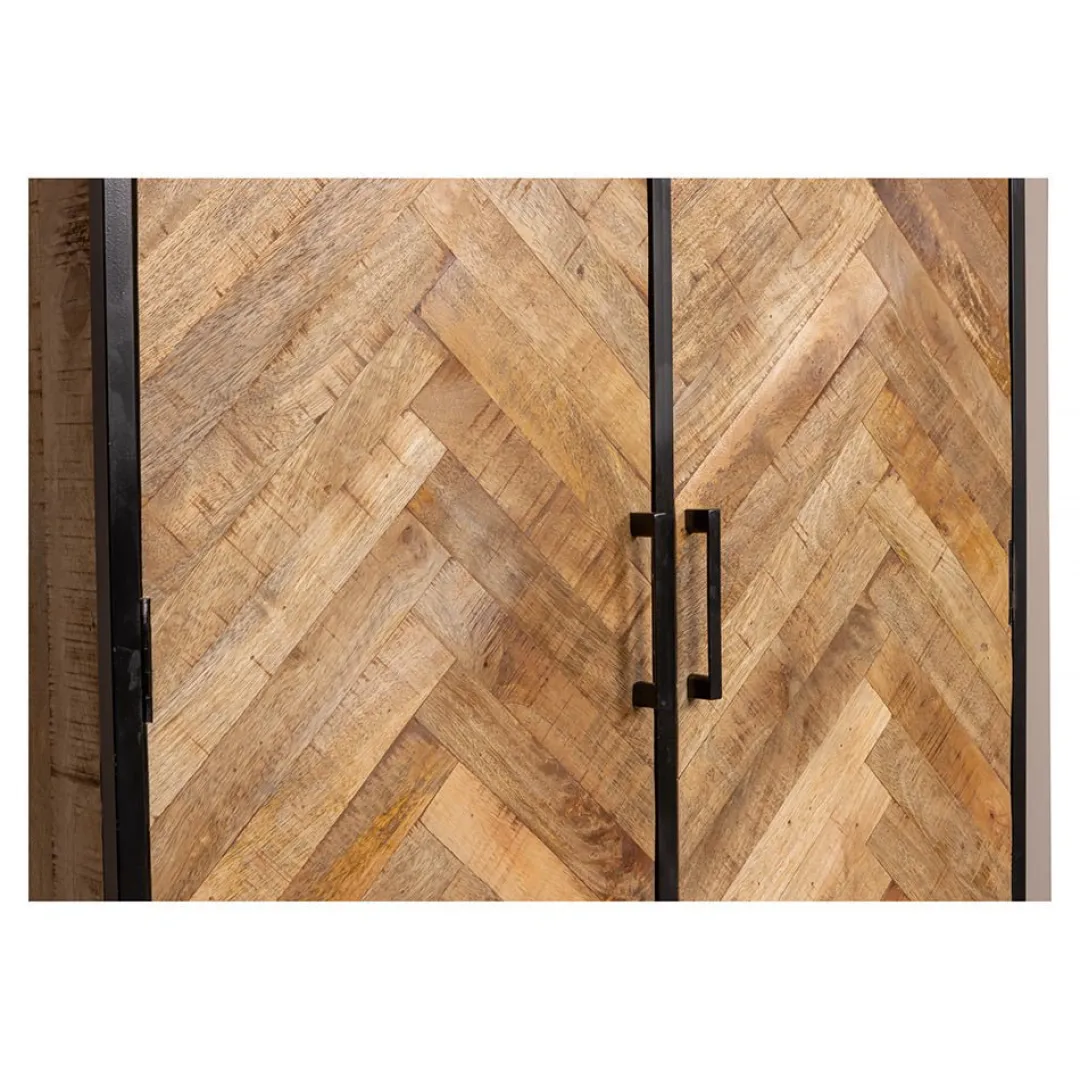 De dichte wandkast New Haven blinkt uit in schoonheid! Aan de robuuste combinatie van het warme mangohout met de metalen accenten is een stijlvol visgraatpatroon toegevoegd. Het meubel kan in alle kamers van het huis van pas komen en kan uitstekend als boekenkast, bijkeukenkast of zelfs als kledingkast worden gebruikt. Achter de deuren liggen drie brede planken en aan de onderkant zitten nog vier lades gevestigd om allerlei eigendommen op te kunnen bergen.