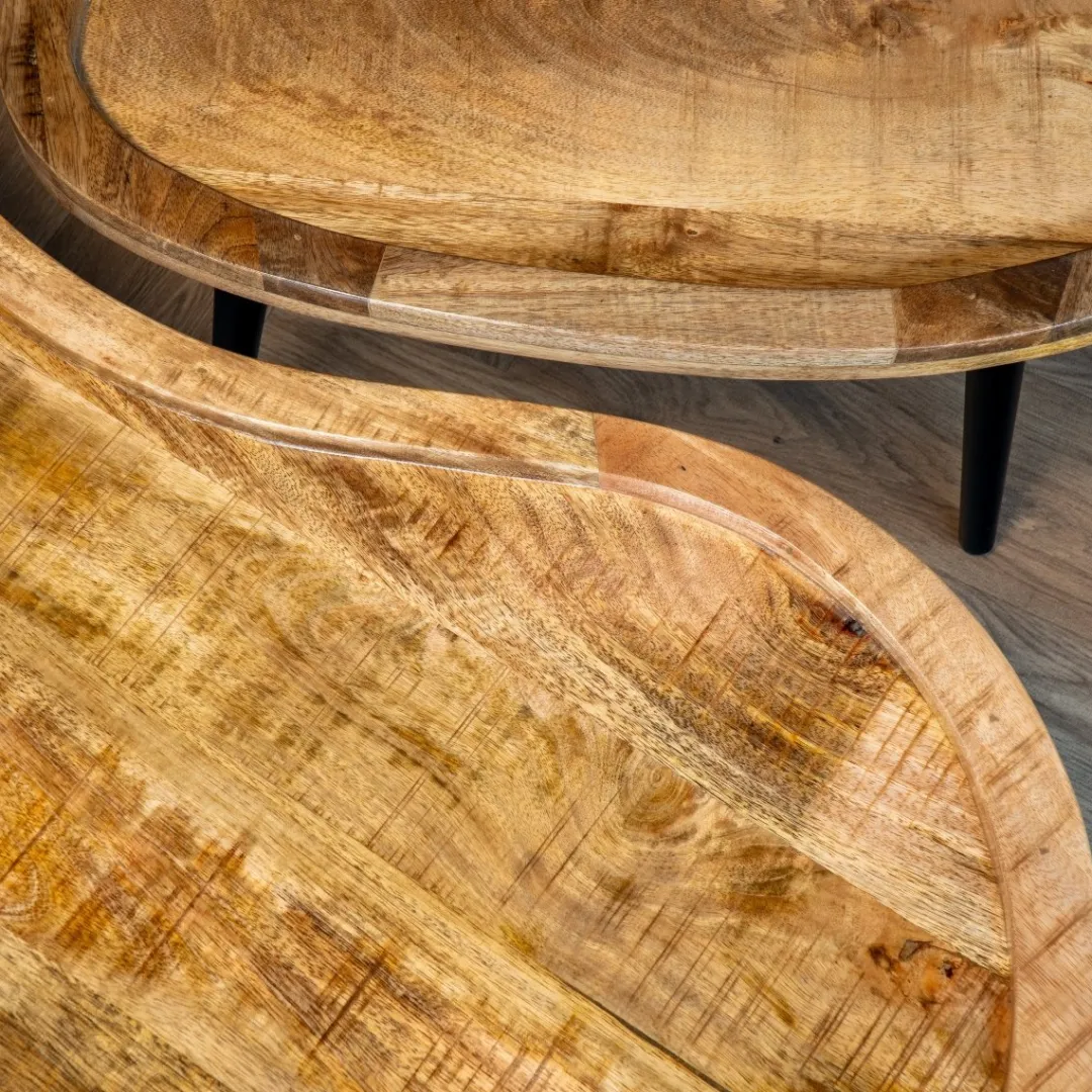 Design: Wat de Mila set bijzonder maakt, zijn de organische, vloeiende vormen van de tafels. Deze unieke vormgeving zorgt ervoor dat de tafels naadloos in elkaar passen, wat een speels en dynamisch effect geeft aan je woonruimte. De natuurlijke afwerking van het hout benadrukt de authentieke schoonheid en maakt elke tafel uniek.