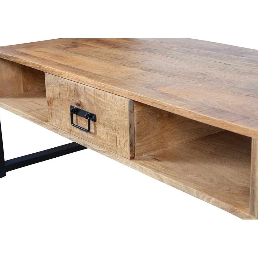 Deze stoere mangohouten salontafel Britt past in ieder interieur. De ruimte onder het hout geeft een ruimtelijk effect aan de salontafel. Aan de voor- en achterzijde van de tafel zit een lade en daarnaast is er nog voldoende ruimte in de open vakken om spulletjes in op te bergen.