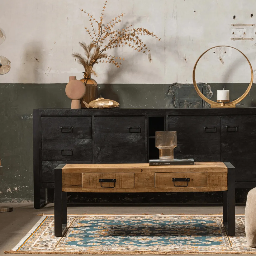 Over het massieve mangohout worden meerdere lagen houtolie en een blanke, natuurlijke bijenwas aangebracht om het hout te beschermen tegen vocht, vuiligheid en kringen. De handgrepen en de poten zijn gemaakt van zwart gepoedercoat metaal.