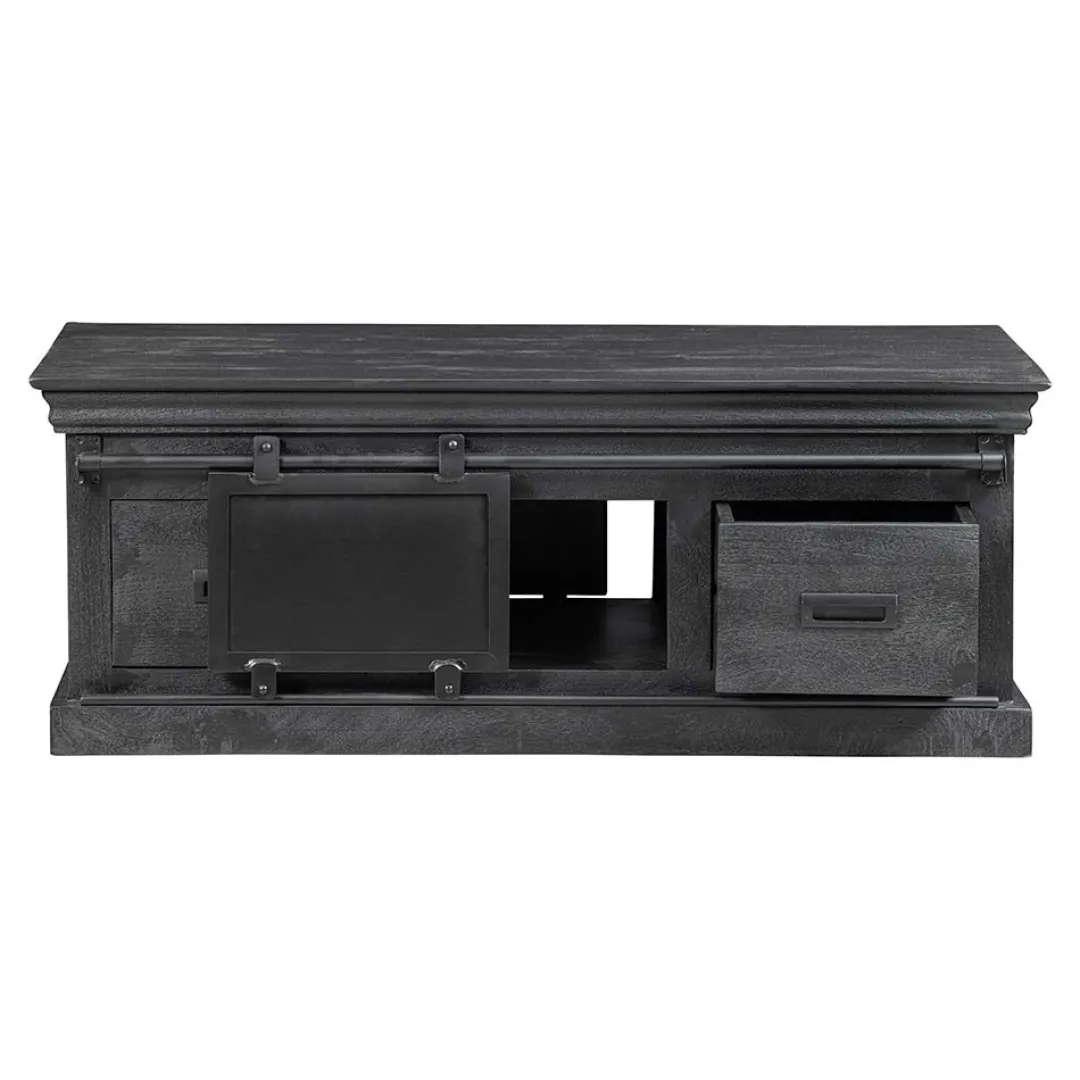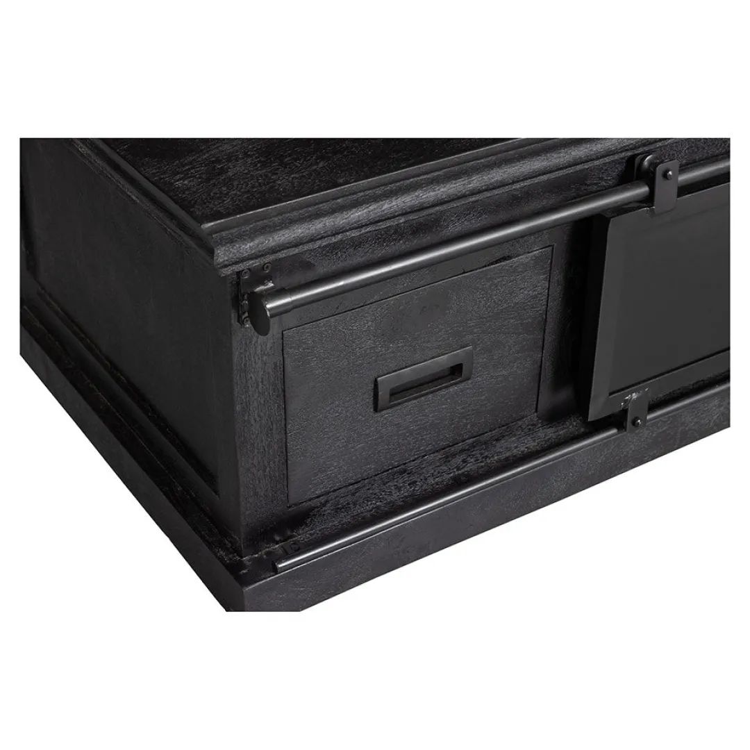 Het mangohout is massief en is eerst gezandstraald, waarna het behandeld wordt met zwarte verfbeits en tenslotte wordt afgewerkt met een donkere, natuurlijke bijenwas om het hout te beschermen tegen vocht, vuiligheid en kringen. De handgrepen, de schuifdeuren en de rails zijn gemaakt van zwart gepoedercoat metaal.