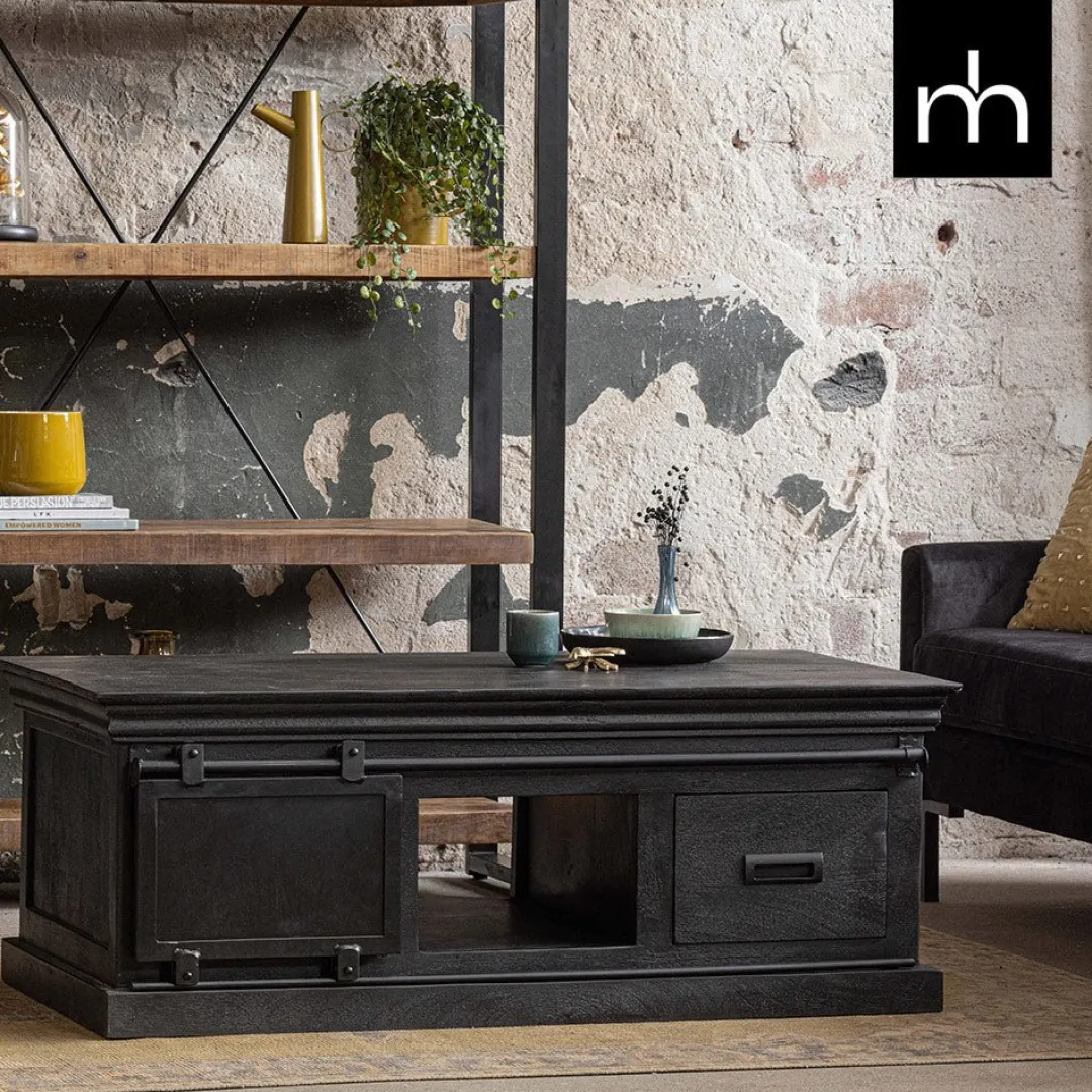 De zwarte Portland salontafel is uniek in zijn soort. Het meubel heeft een robuust uiterlijk en de fraaie combinatie van het stalen deurtje met het zwarte mangohout is de blikvanger van elk interieur. De salontafel heeft twee lades aan de zijkanten om gebruiksvoorwerpen op te ruimen een ook achter de stalen schuifdeur is nog voldoende opbergruimte.