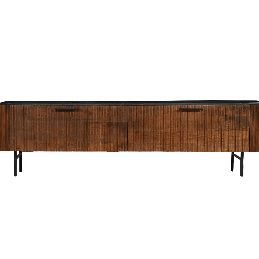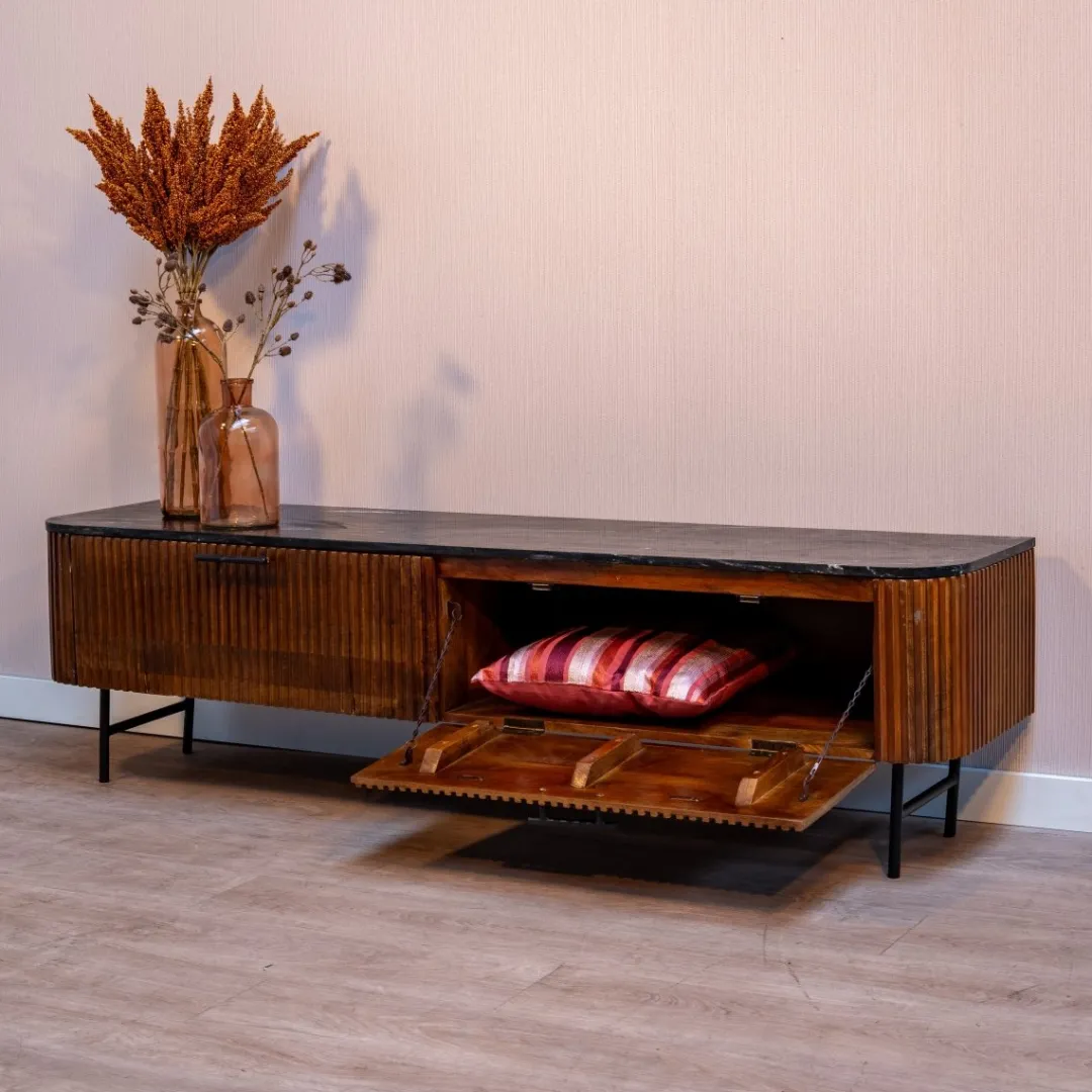 Het Mangohouten TV meubel Austin is een stijlvolle toevoeging aan elk interieur. Met een prachtige walnootkleurige laklaag en een elegant marmeren blad straalt dit meubel pure klasse uit.