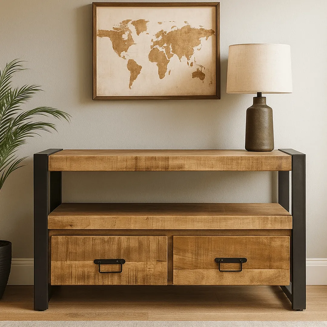 Het kleinste TV meubel uit de Britt-serie blinkt uit door zijn bescheiden, warme, knusse karakter dat hij krijgt van het robuuste mangohout en de zwartmetalen accenten. De bovenste plank biedt precies genoeg ruimte om de televisie neer te zetten en in de tussenruimte kan apparatuur zoals een tv-ontvanger of een geluidsbox. In de twee lades is er ook voldoende ruimte om accessoires op te bergen.