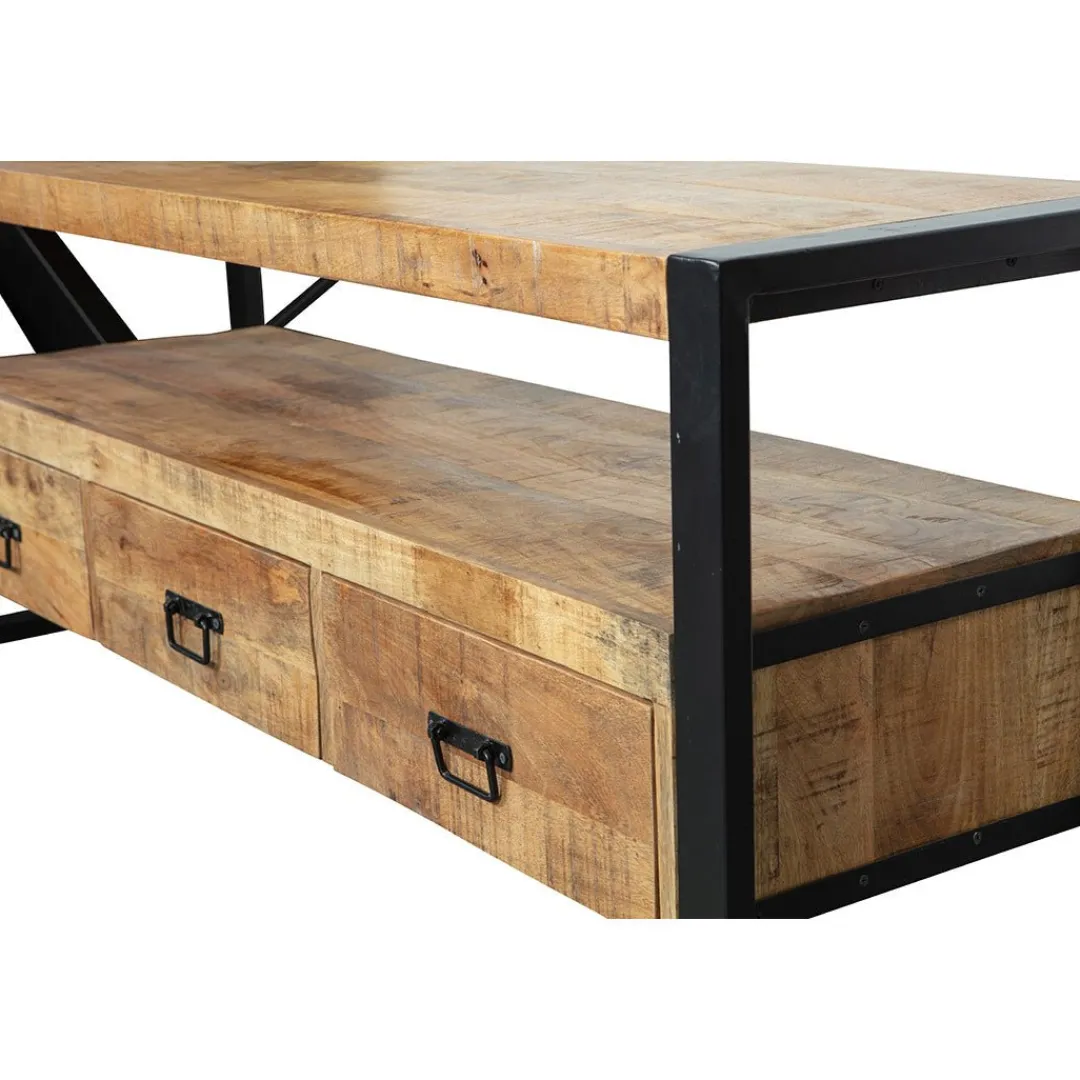 Het mangohouten TV meubel Britt is eenvoudig maar daarom juist een tijdloze toevoeging aan je interieur. Het meubel beschikt over drie lades waarin allerlei gebruiksvoorwerpen kunnen worden opgeborgen en de tussenruimte kan gebruikt worden om tv-ontvangers, muziekboxen of andere apparatuur een handige plek te geven.